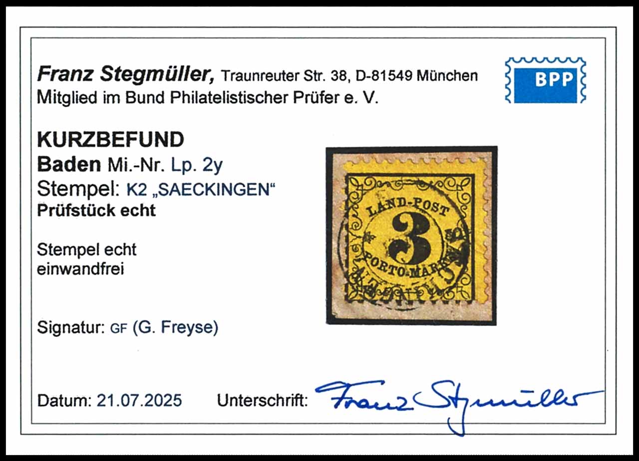 3 Kreuzer Landpost auf y-Papier tadellos auf Briefstück mit K2 "SAECKINGEN", Fotobefund Franz Stegmüller BPP "Stempel echt, einwandfrei", Mi. 500.-