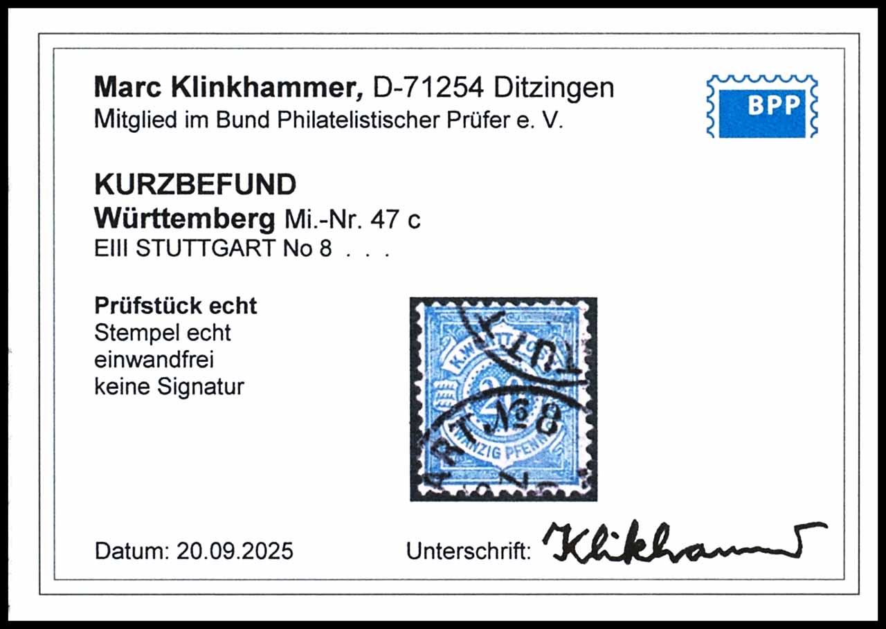 20 Pfg weiße Ziffern im Kreis, dunkelkobalt, entwertet "STUTTGART No. 8", farbfrisches Kabinettstück, selten, Fotobefund Marc Klinkhammer BPP (2025) "einwandfrei", Mi. 300.-