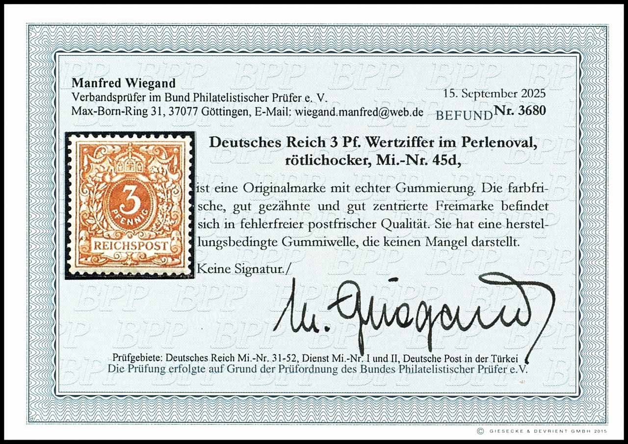 3 Pfennig Krone/Adler, rötlichocker, postfrisch, tadellose Erhaltung, unsigniert, Fotobefund Manfred Wiegand BPP (2025) "in fehlerfreier, postfrischer Qualität.", Mi. 500.-