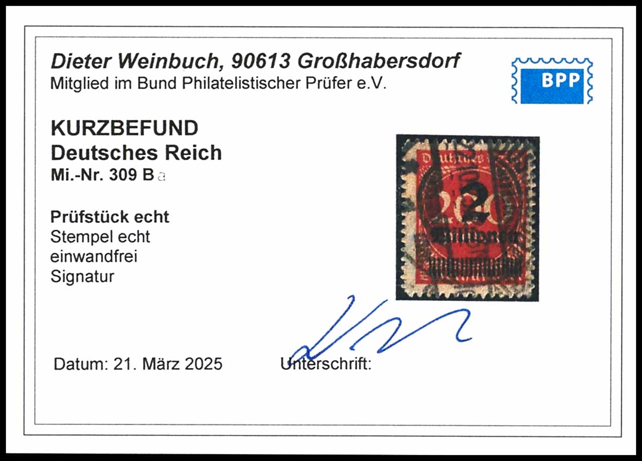 2 Millionen auf 200 Mark, bräunlichrot, durchstochen, gestempelt, tadellose Erhaltung, Fotobefund Dieter Weinbuch BPP (2025) "echt und einwandfrei", Mi. 200.-