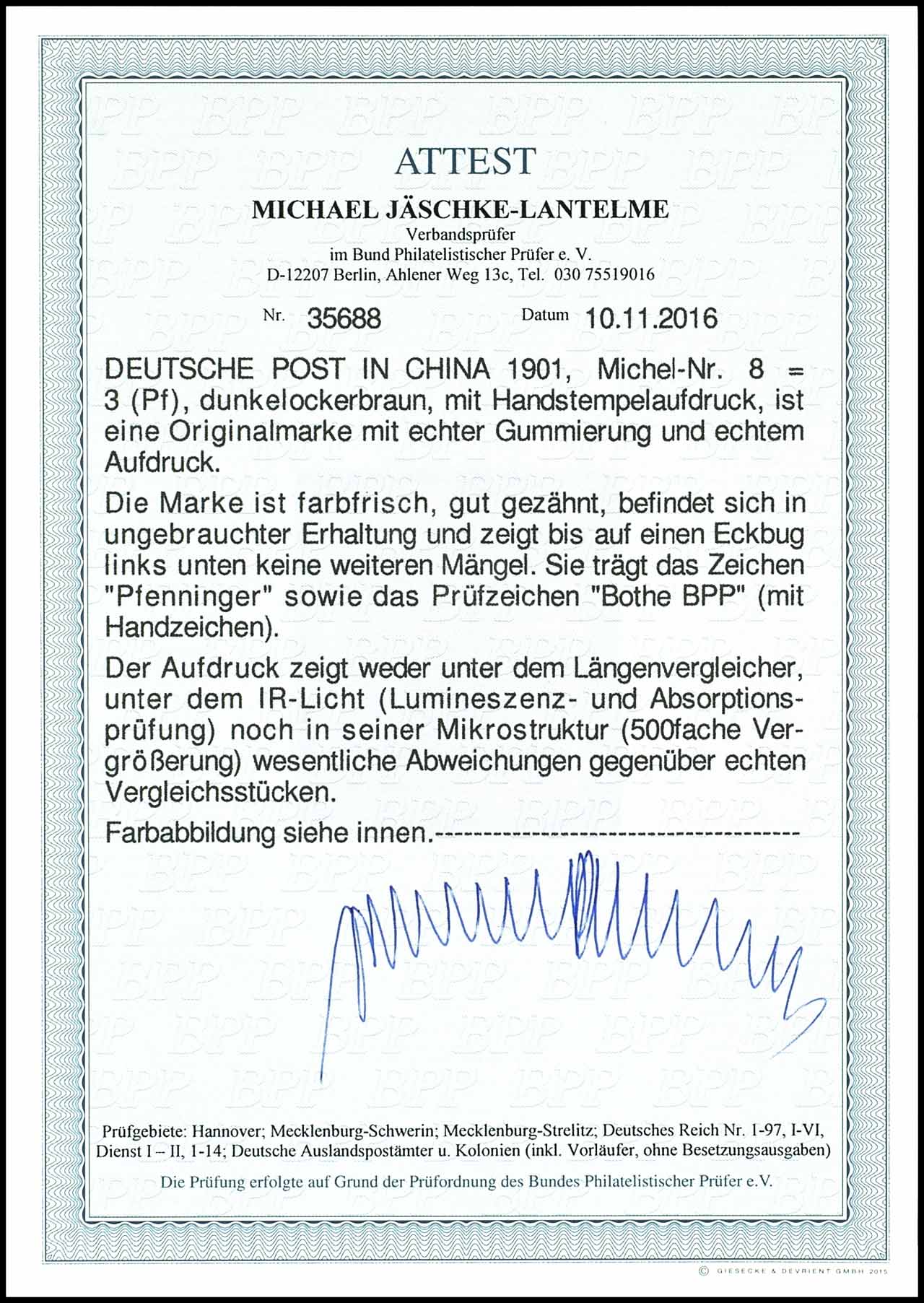 3 (Pf) dunkelockerbraun mit Handstempelaufdruck, ungebraucht, leichter Eckbug, sonst tadellose Erhaltung, Attest Jäschke-L. BPP, Mi. 750.-