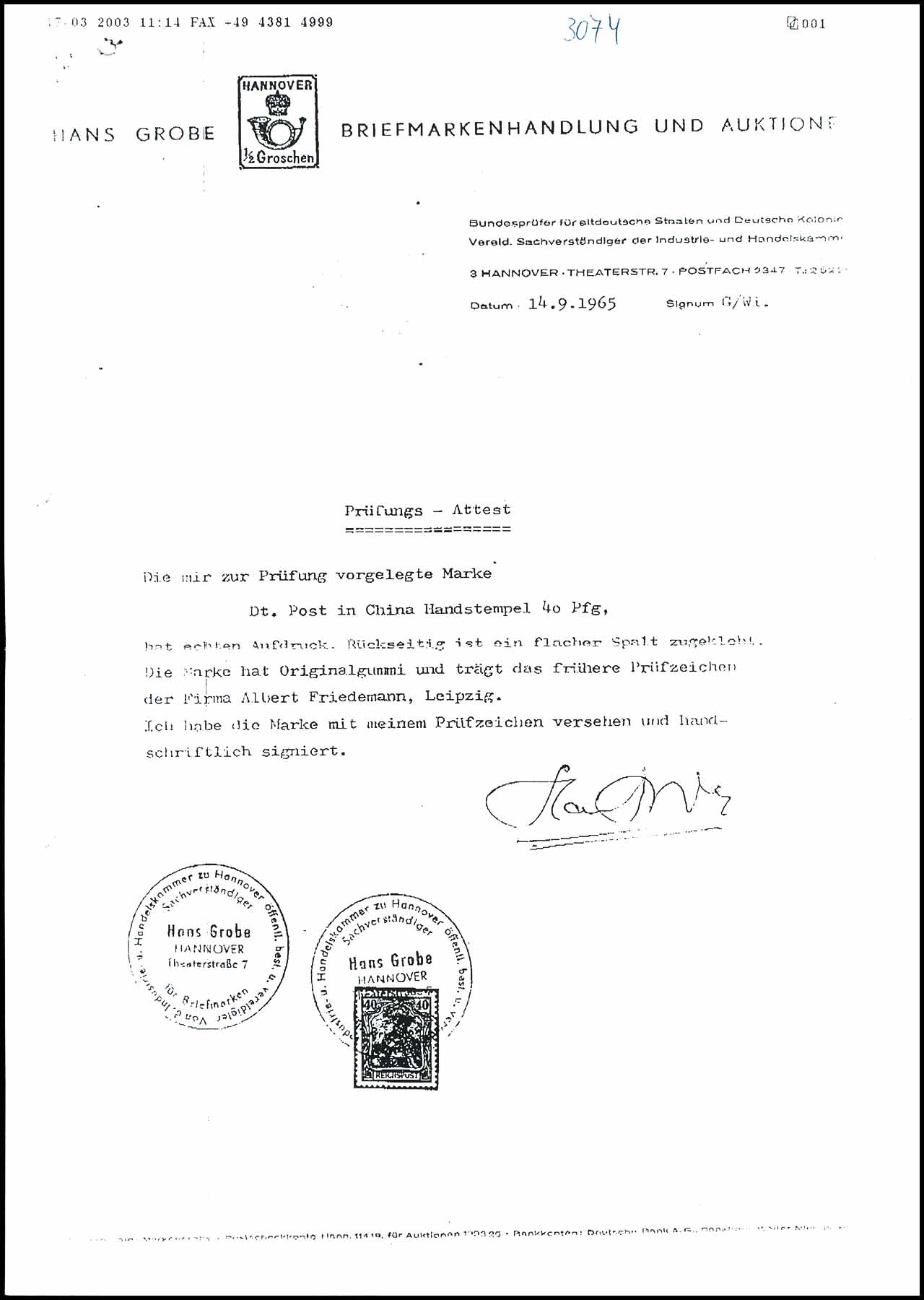 40 (Pf) karmin/schwarz mit Handstempelaufdruck, ungebraucht, repariert, jedoch bildseitig sehr ansehnliches Stück, geprüft Friedemann, Attestkopie Grobe, von Jäschke-Lantelme abgelehnt, Aufdruck mit Originalstempel, aber Aufdruckfarbe gering abweichend