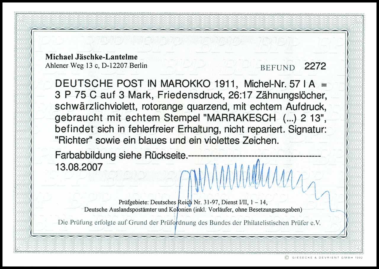 3 Pes. 75 Cts. auf 3 Mark schwärzlichviolett, gestempelt, tadellose Erhaltung, Fotobefund Jäschke-L. BPP, Mi. 260.-