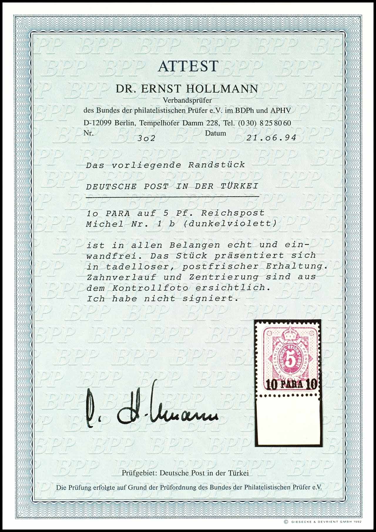 10 Para auf 5 Pfennig violettpurpur tadellos postfrisch vom Unterrand und noch unsigniert, Fotoattest Dr. Hollmann BPP "in tadelloser, postfrischer Erhaltung." Mi. 950.-