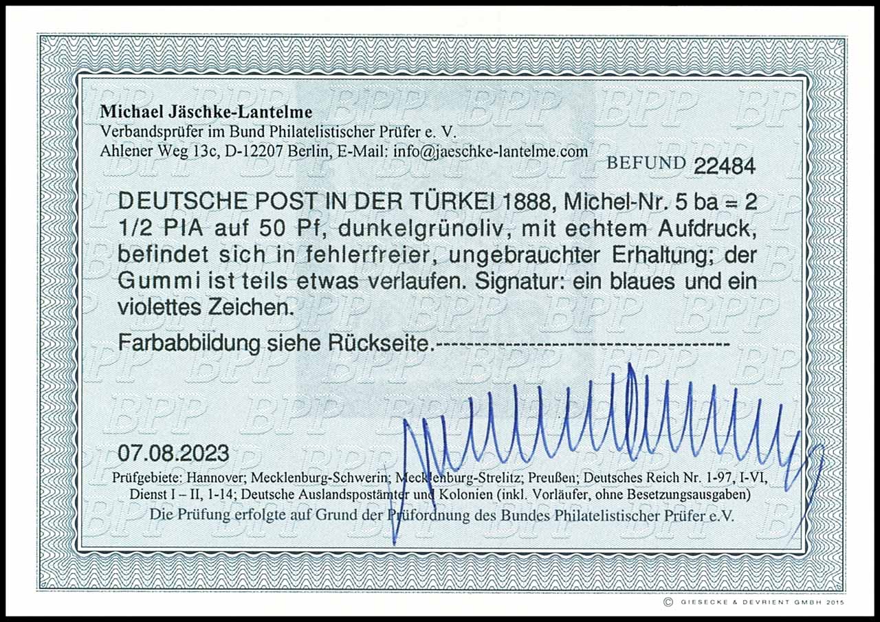 1/2 Piaster auf 50 Pfennig dunkelgrünoliv, ungebraucht mit Originalgummierung (verlaufen), tadellose Erhaltung, signiert, Fotobefund Michael Jäschke-Lantelme BPP (2025), Mi. 350.-