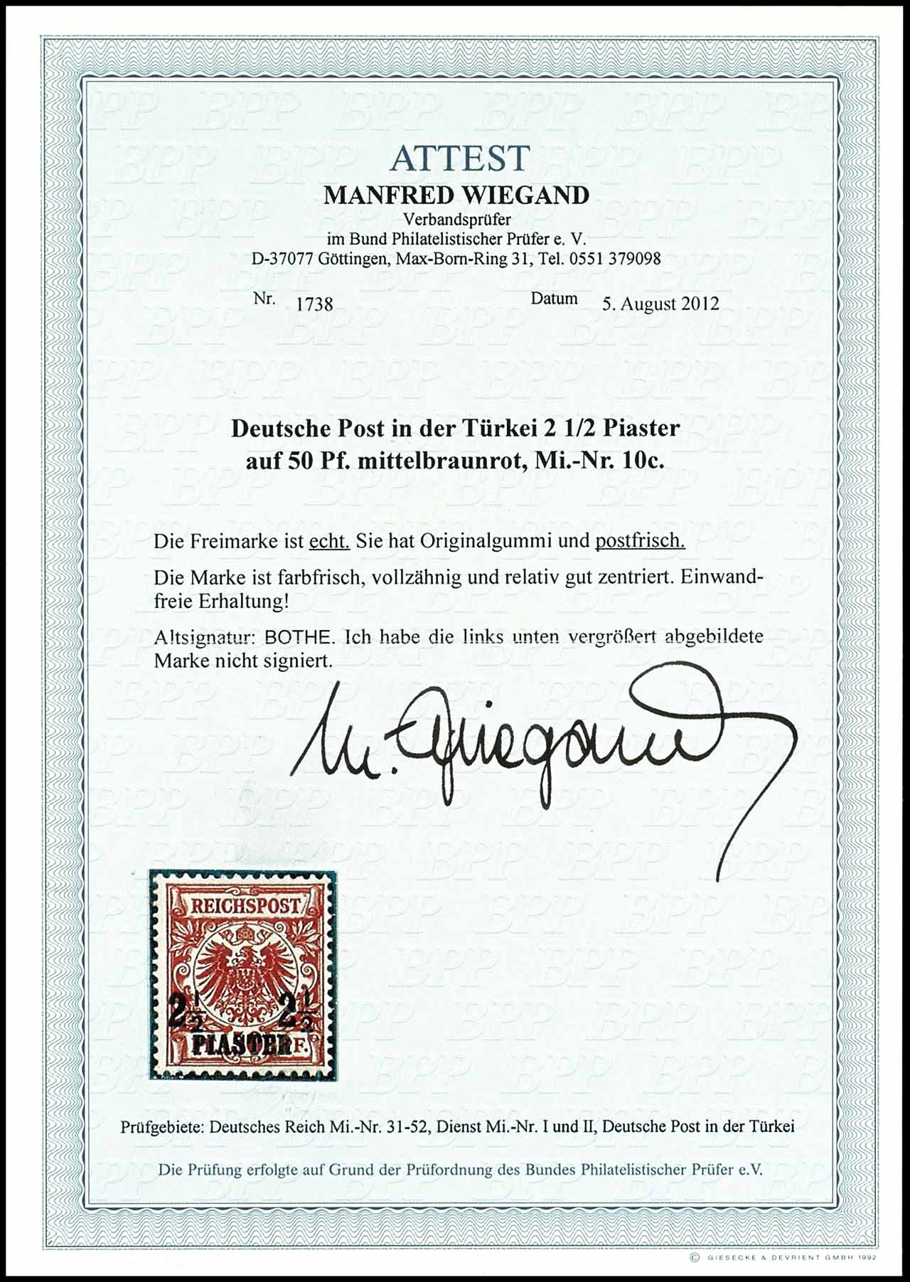 2 1/2 Piaster auf 50 Pfennig Krone/Adler mittelbraunrot tadellos postfrisch, tiefst geprüft Bothe und Fotoattest Manfred Wiegand BPP "Einwandfreie Erhaltung!" Mi. 1.400.-