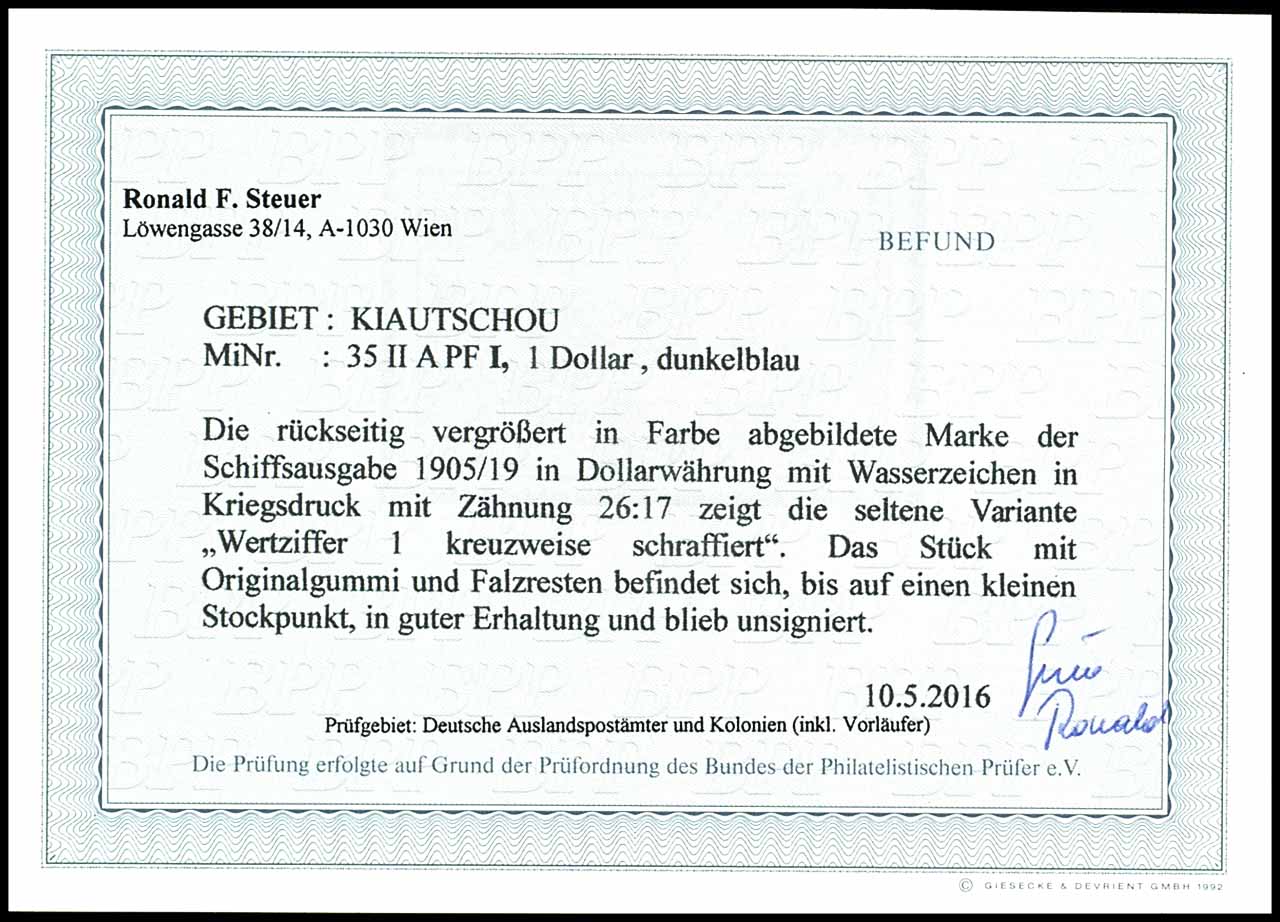 1 Dollar dunkelblau, die seltene Urmarke mit Plattenfehler I "Wertziffer 1 kreuzweise schraffiert", ungebraucht, tadellose Erhaltung, Befund Steuer BPP, Mi. 300.-+