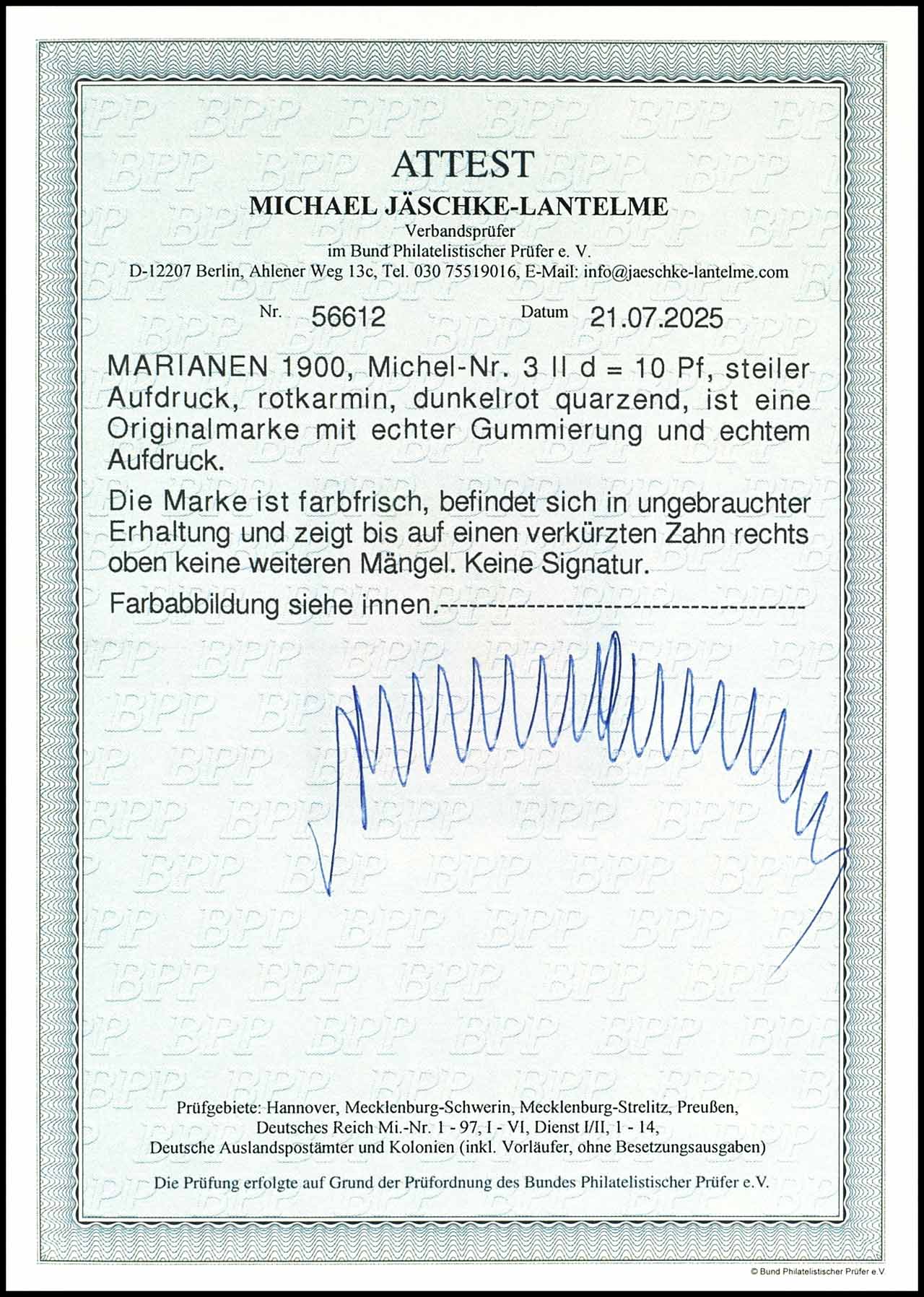 10 Pfennig Krone/Adler rotkarmin, mit steilem Aufdruck "Marianen", ungebraucht mit Originalgummierung, ein verkürzter Zahn, sonst tadellose Erhaltung, unterbewertete Rarität, nur wenige Stücke bekannt, Fotoattest Michael Jäschke-Lantelme BPP, Mi. 1.200.-++