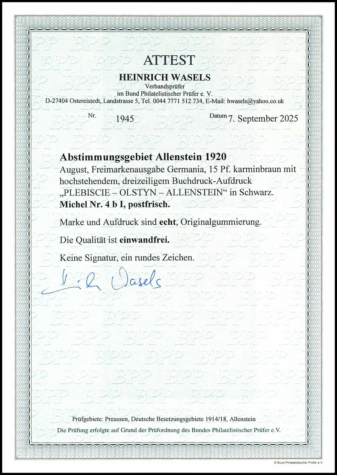 15 Pfennig Germania karminbraun mit dreizeiligem höherstehendem Bdr.-Aufdruck - sog. Sieges-Marke, postfrisch, tadellose Erhaltung, Fotoattest Heinrich Wasels BPP (2025) "Die Qualität ist einwandfrei.", Mi. -.-