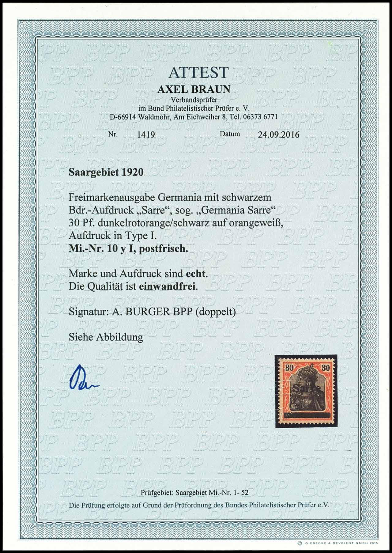 30 Pfg Germania auf orangeweißem Papier mit Aufdruck "Sarre" in Type I, postfrisch, tadellose Erhaltung, Fotoattest Axel Braun BPP "Die Qualität ist einwandfrei.", Mi. 500.-