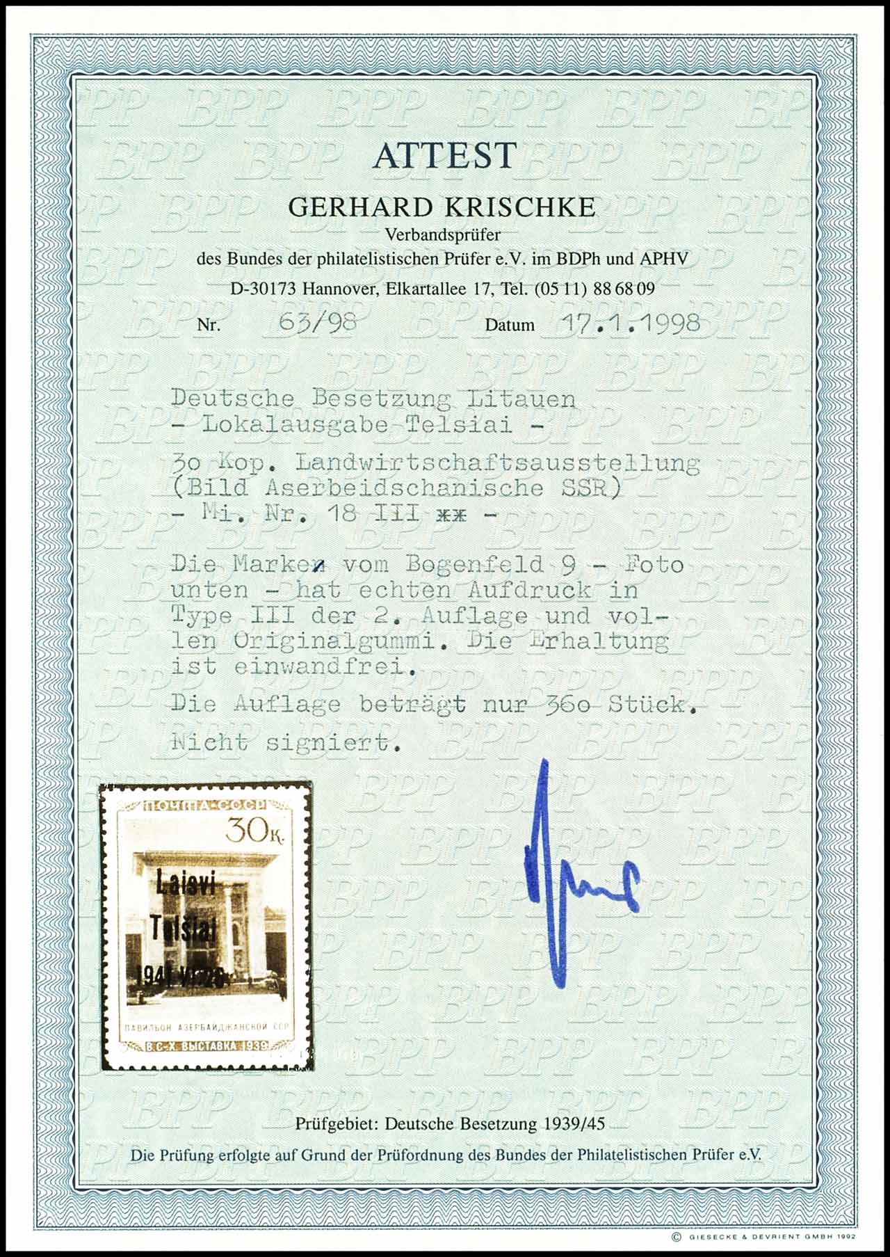 30 Kop. "Pavillon Aserbaidschanische SSR" tadellos postfrisch und noch unsigniert, Fotoattest Krischke BPP "Die Erhaltung ist einwandfrei." Mi. 450.-