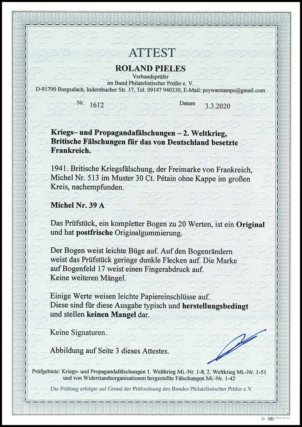 Britische Fälschung für das von Deutschland besetzte Frankreich, 30 C. karminrot im kompletten Bogen zu 20 Marken, postfrisch, leichte Büge, Bogenränder etwas fleckig, Bogenfeld 17 Fingerabdruck, Fotoattest Roland Pieles BPP, Mi. 2.000.-