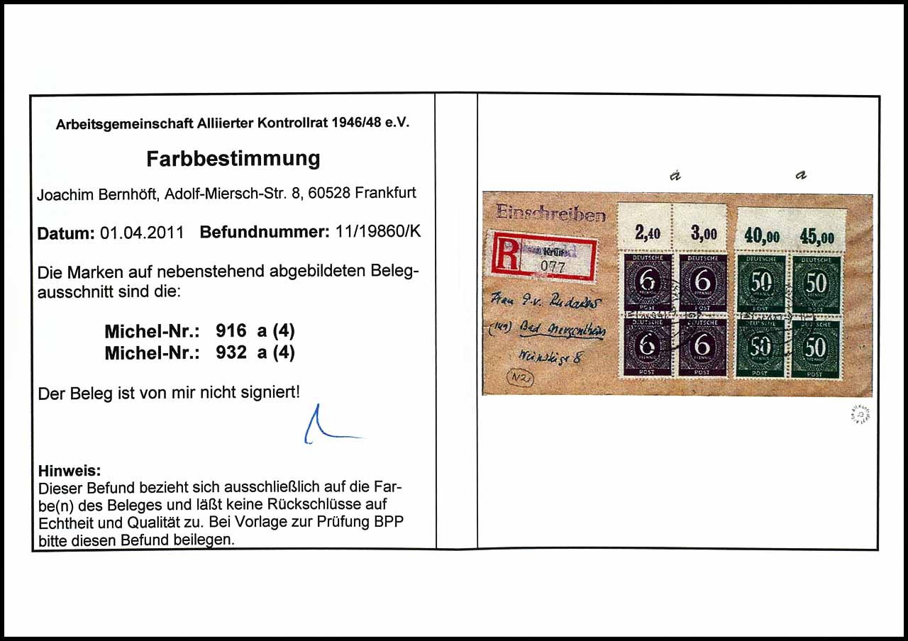 6 Pf. dunkelviolett im 4er-Block vom Oberrand (durchgezähnt) und 50 Pf. in a-Farbe im 4er-Block vom Oberrand (nichtdurchgezähnt), je Plattendruck, auf überfrankiertem R.-Brief vom 25.9.47 nach Bad Bergentheim, Fotobefund ARGE (Bernhöft), Mi. 310.-