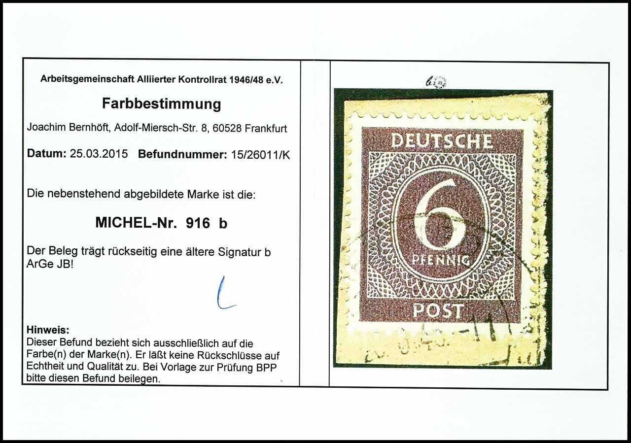 6 Pf. Ziffer, schwarzviolettgrau auf kleinem Briefstück, Fotobefund ARGE, Mi. 400.-