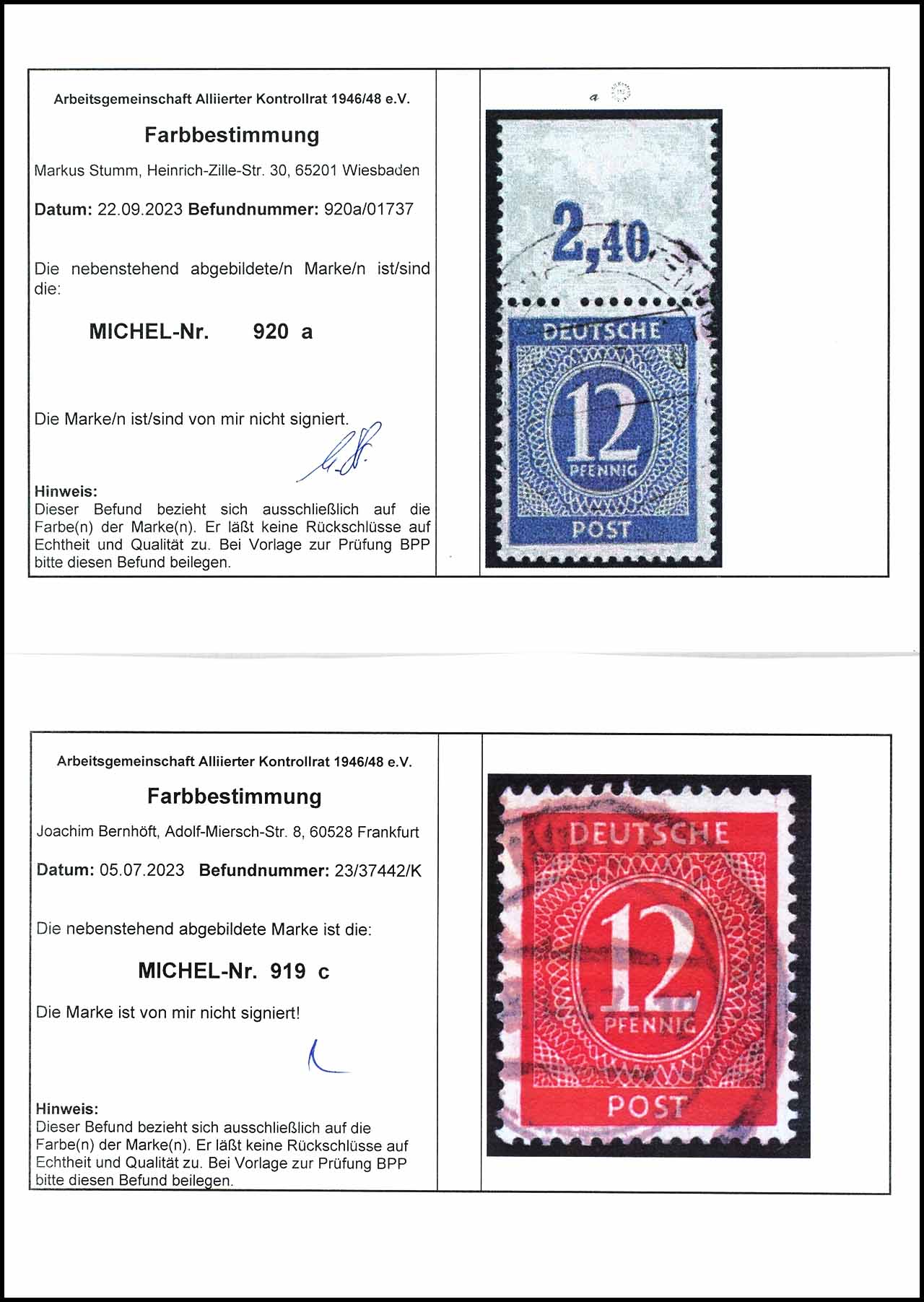 12 Pf. dunkelrosa und 12 Pf. dunkelgrau vom Oberrand im Plattendruck (durchgezähnt), je tadellos, gestempelt, Fotobefund ARGE, Mi. 530.-