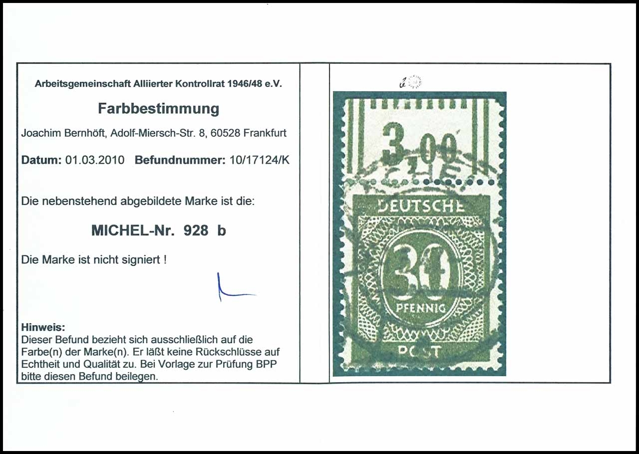 30 Pf. Ziffer bräunlicholiv vom Oberrand im Walzendruck, links oben zwei Zähne angetrennt, tadellos gestempelt, Fotobefund ARGE, Mi. 250.-