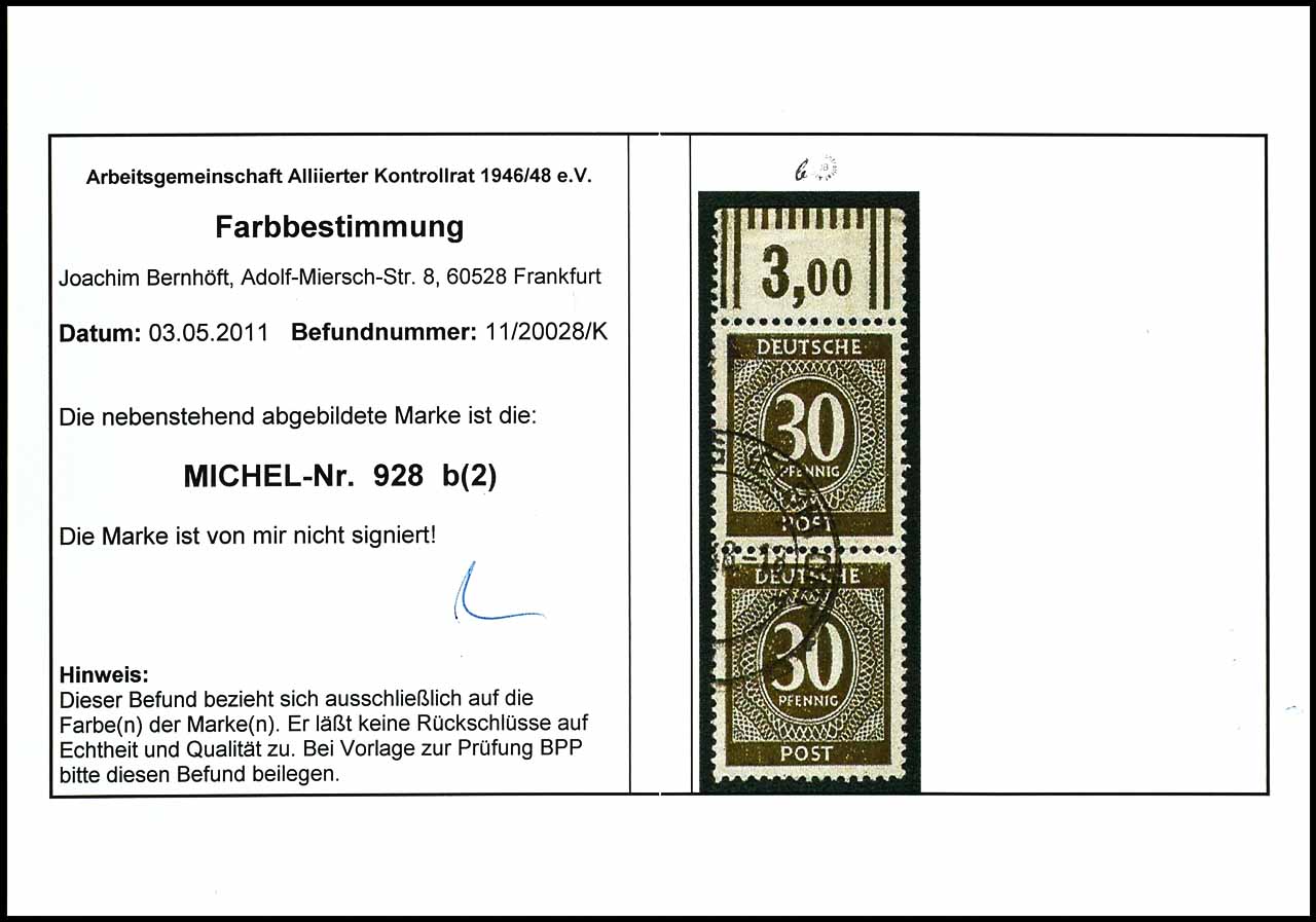 30 Pf. Ziffer bräunlicholiv, senkrechtes Paar vom Oberrand im Walzendruck, durchgezähnt, gestempelt, Fotobefund ARGE, Mi. 250.-