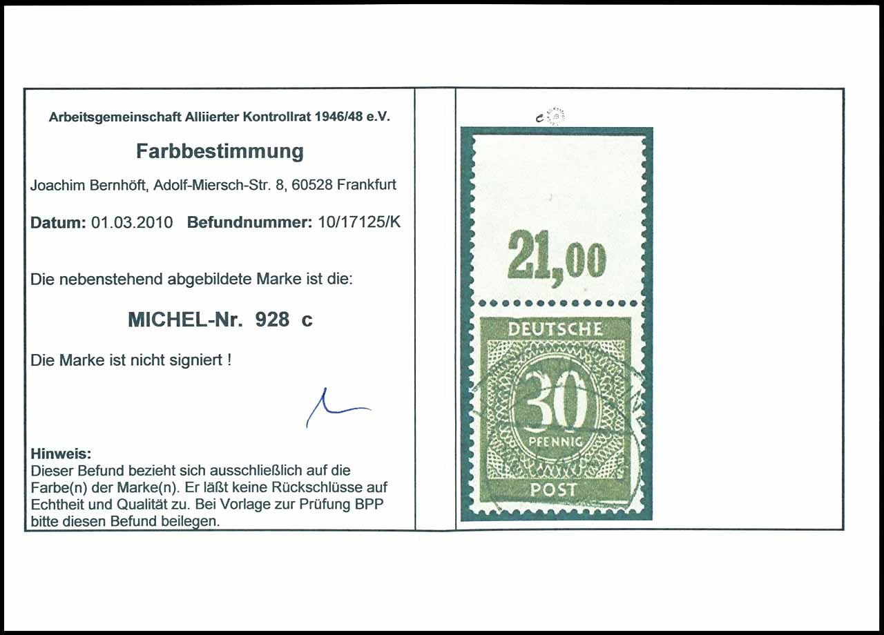 30 Pf. Ziffer bräunlicholiv vom Oberrand im Plattendruck, durchgezähnt, tadellos gestempelt, Fotobefund ARGE, Mi. 500.-