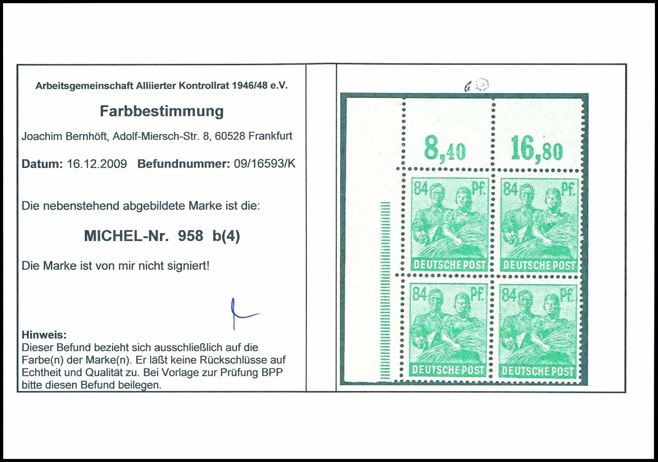 84 Pf. Arbeiter gelbsmaragdgrün, Viererblock aus der linken oberen Bogenecke im Plattendruck, tadellos postfrisch, Fotobefund ARGE, Mi. 330.-