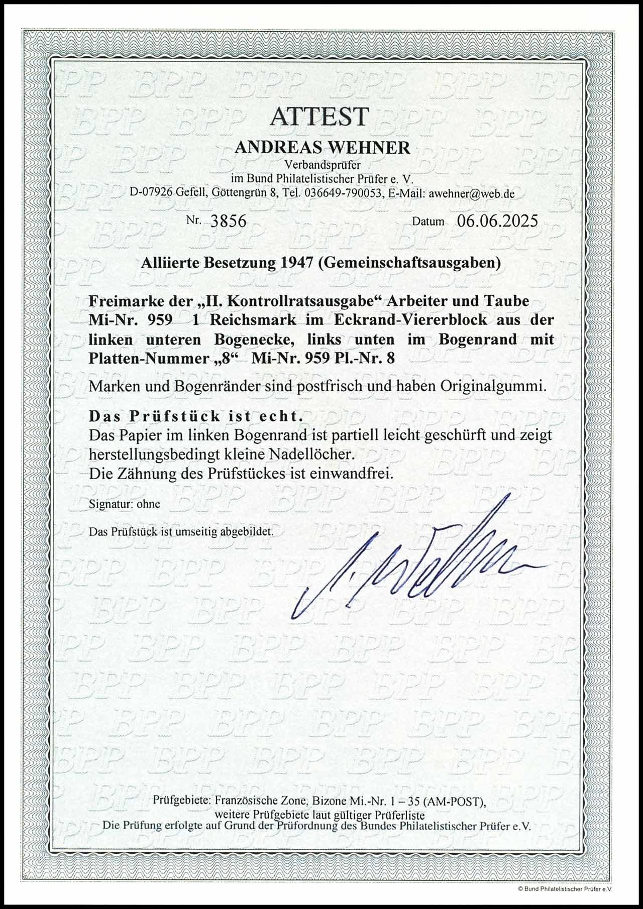 1 Mark Taube, Eckrandviererblock unten links mit Plattennummer "8", postfrisch, im linken Bogenrand Papier partiell geschürft - darüber hinaus tadellos, seltene Plattennummer, Fotoattest Andreas Wehner BPP (2025)