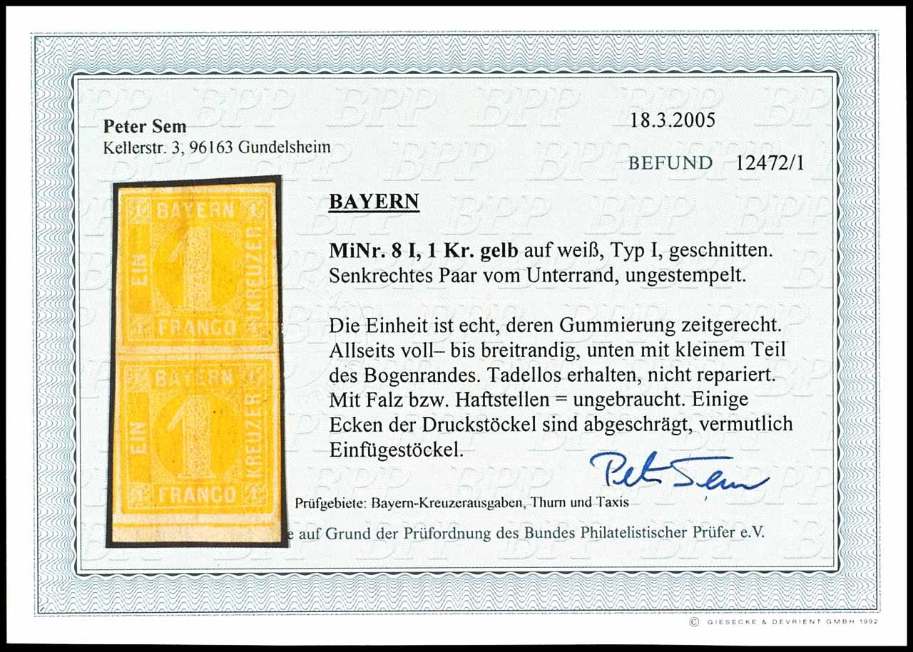 1 Kreuzer gelb, Type I, vollrandig geschnittenes senkrechtes Kabinettpaar, ungebraucht mit Originalgummierung, Fotobefund Peter Sem BPP, Mi. 250.-