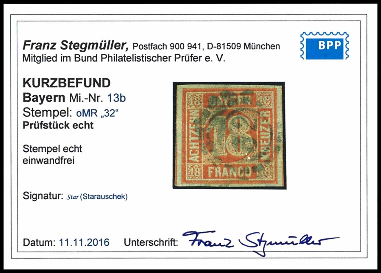 18 Kreuzer orangerot, vollrandiges und farbfrisches Kabinettstück, entwertet mit offenem Mühlradstempel "32" (Bamberg), Fotobefund Franz Stegmüller BPP "einwandfrei", Mi. 600.-