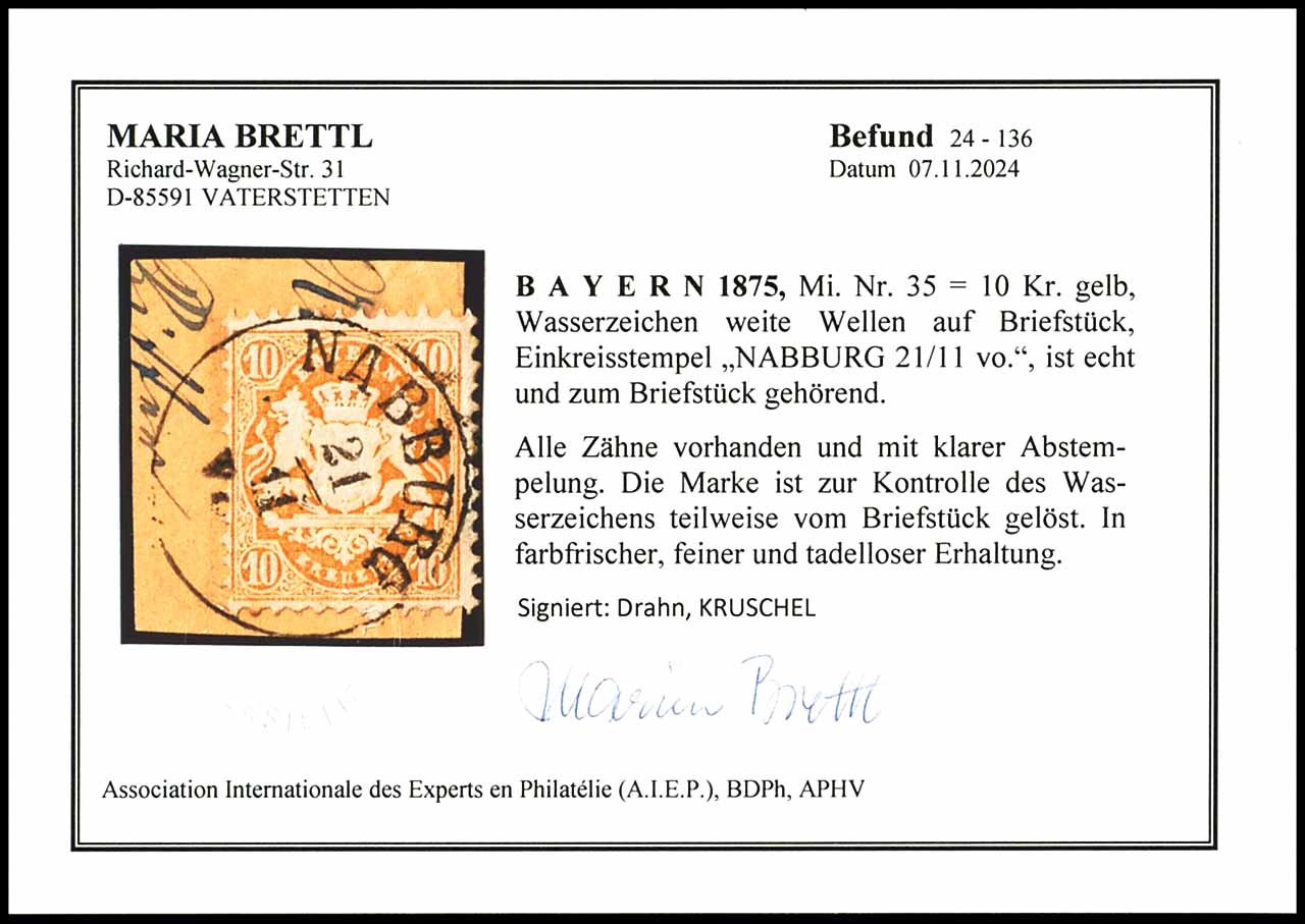 10 Kreuzer dunkelchromgelb in farbfrischer und vollzähniger Kabinetterhaltung, mit ideal klar und vollständig aufsitzendem K1 NABBURG 21/11 auf einmalig attraktivem Liebhaber-Briefstück, teils zur Kontrolle des Wasserzeichens gelöst, geprüft Drahn und Kruschel sowie Fotobefund Brettl