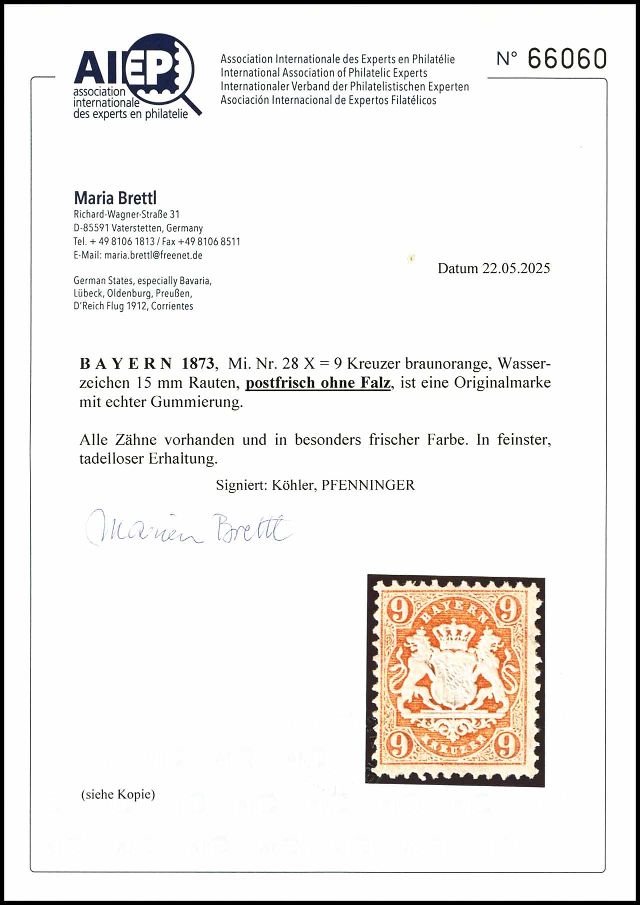 9 Kreuzer braunorange, Wasserzeichen 15 mm Rauten, farbfrisches und vollzähniges Kabinettstück, postfrisch, signiert Köhler, Pfenninger und Fotoattest Maria Brettl AIEP (2025) "... tadelloser Erhaltung."