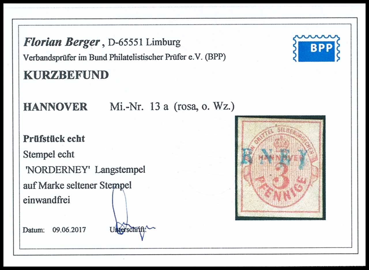 3 Pfennige / 1/4 Silbergroschen rosa, entwertet mit L1 "(NORDE)RNEY", farbfrisches Kabinettstück, Fotobefund Florian Berger BPP "einwandfrei, auf Marke seltener Stempel"