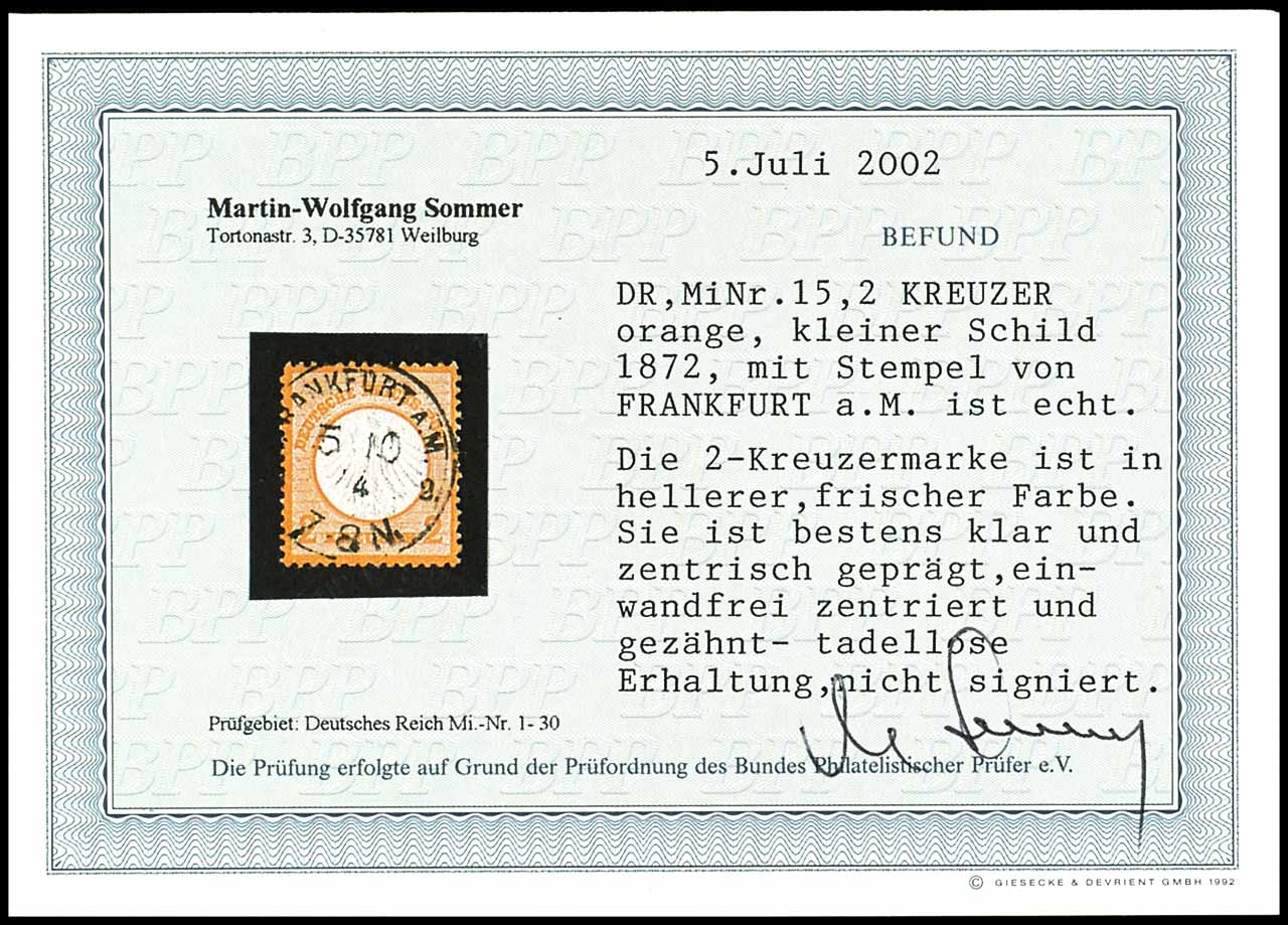2 Kreuzer kleiner Schild orange, entwertet mit Einkreisstempel "FRANKFURT a M. 5 10 74", tadellose Erhaltung, Fotobefund Martin-Wolfgang Sommer BPP "tadellose Erhaltung"