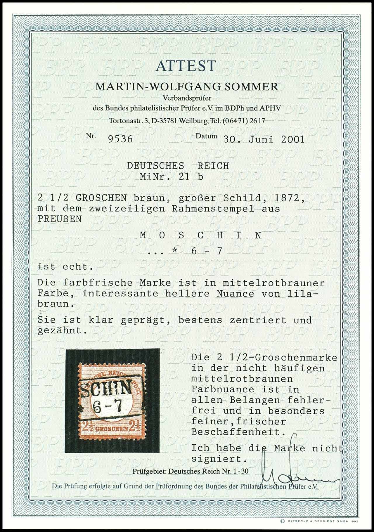 2 1/2 Groschen großer Schild, mittelrotbraun, entwertet mit Ra2 "MOSCHIN", tadellose Erhaltung, unsigniert, Fotoattest Martin-Wolfgang Sommer BPP "in besonders feiner, frischer Beschaffenheit."