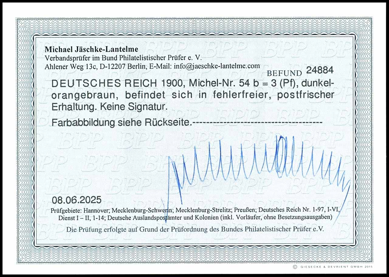 3 Pfennige Germania, dunkelorangebraun, postfrisch, tadellose Erhaltung, unsigniert, Fotobefund Michael Jäschke-Lantelme BPP (2025) "in fehlerfreier, postfrischer Erhaltung."