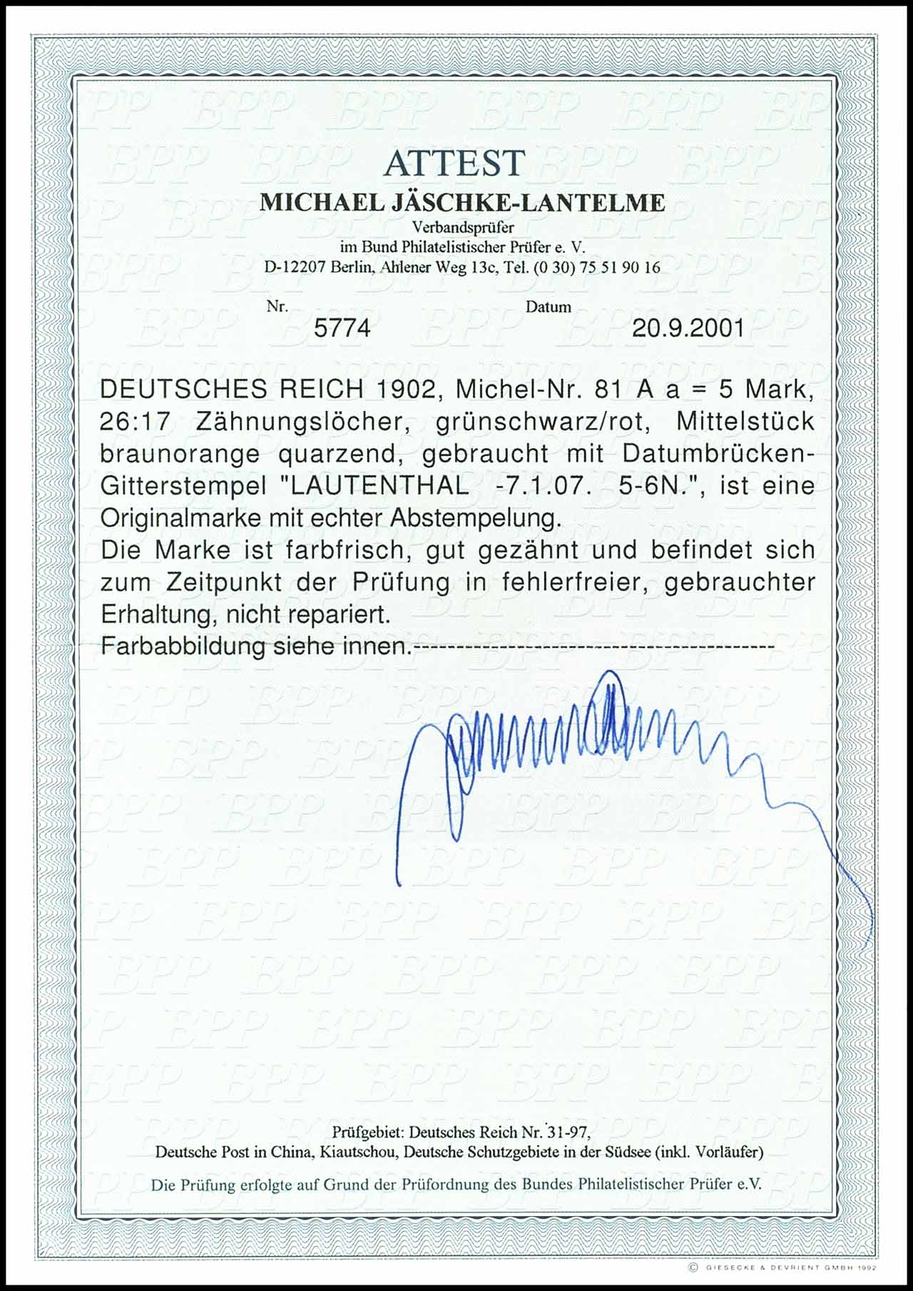 5 Mark grünschwarz/dunkelkarmin, 26 : 17 Zähnungslöcher, entwertet mit Datumbrücken-Gitterstempel "LAUTENTHAL -7.1.07 5-6N", tadellose Erhaltung, unsigniert, Fotoattest Michael Jäschke-Lantelme BPP "in fehlerfreier Erhaltung.", Mi. 450.-