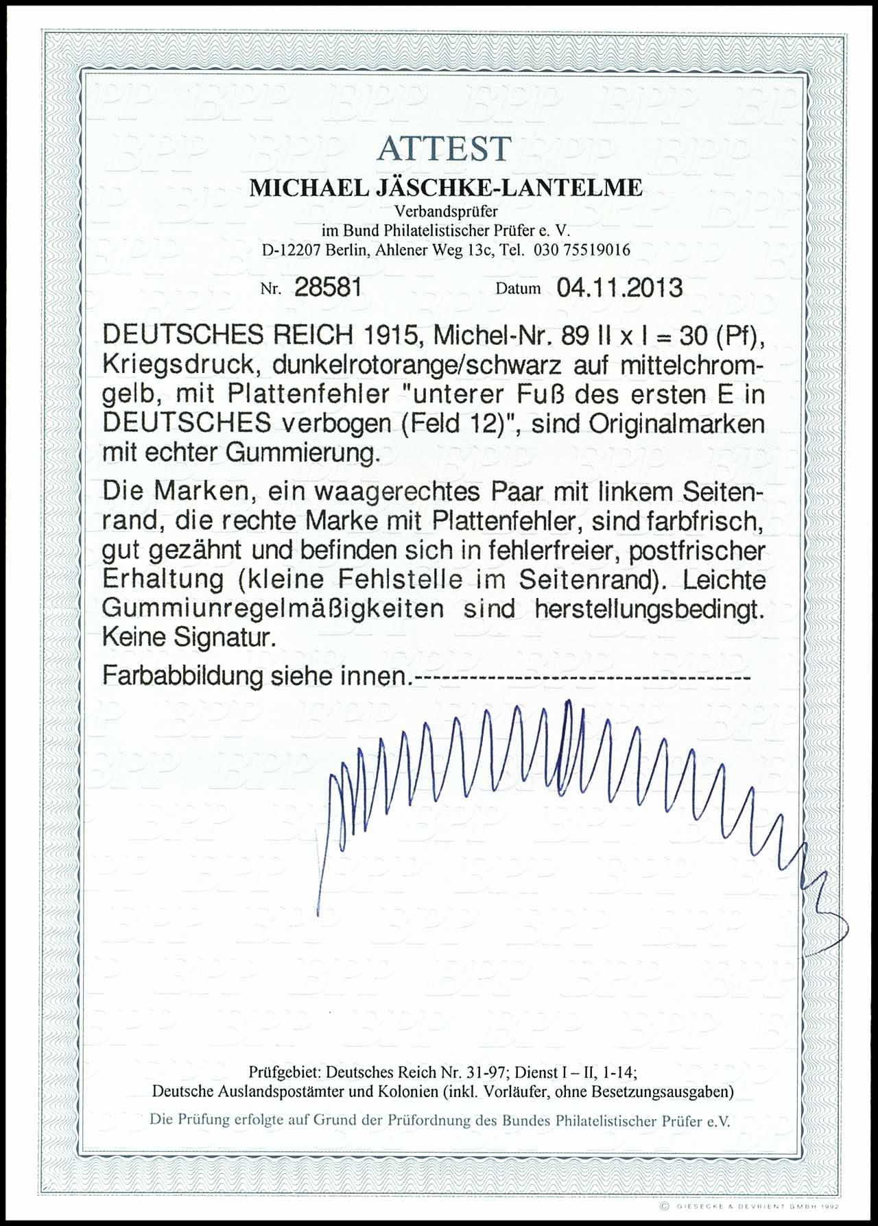 30 Pfennig Germania, Kriegsdruck, mit Plattenfehler "unterer Fuß des ersten E in DEUTSCHES verbogen (Bogenfeld 12)", waagrechtes Paar, postfrisch, tadellose Erhaltung, unsigniert, Fotoattest Michael Jäschke-Lantelme BPP "in fehlerfreier, postfrischer Erhaltung (kleine Fehlstelle im Seitenrand)", Mi. 650.-