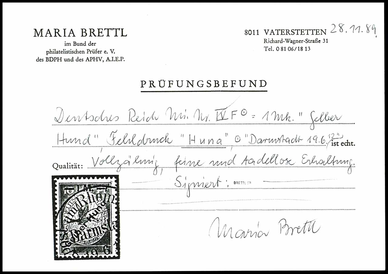 1 Mark Gelber Hund mit Aufdruckfehler "Huna", gestempelt, tadellose Erhaltung, Fotobefund Maria Brettl BPP, Mi. 360.-