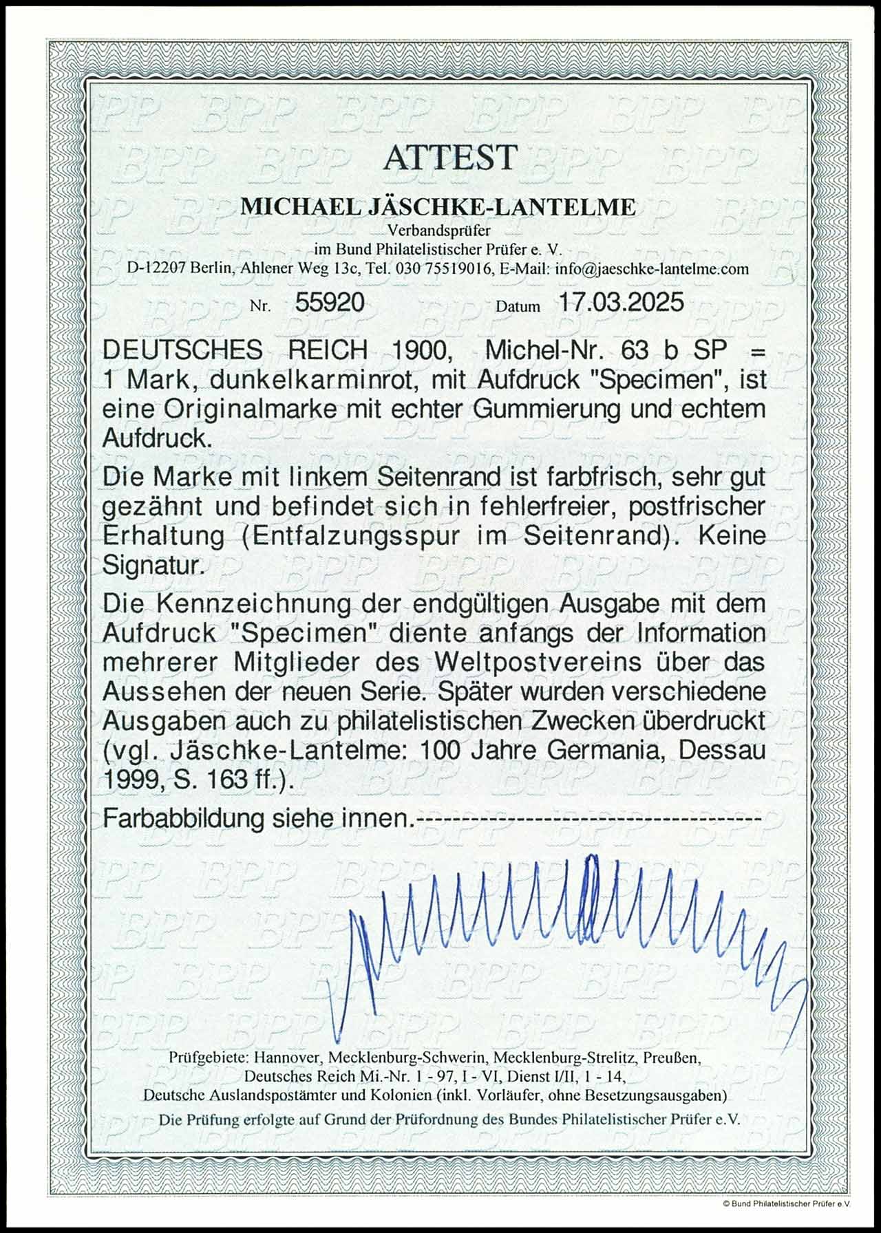 1 Mark Reichspost, dunkelkarminrot, Aufdruck "Specimen", vom linken Bogenrand (Entfalzungsspur im Bogenrand), Marke postfrisch, tadellose Erhaltung, unsigniert, Fotoattest Michael Jäschke-Lantelme BPP (2025) "farbfrisch, sehr gut gezähnt ... in fehlerfreier, postfrischer Erhaltung.", Mi. 1.200.-