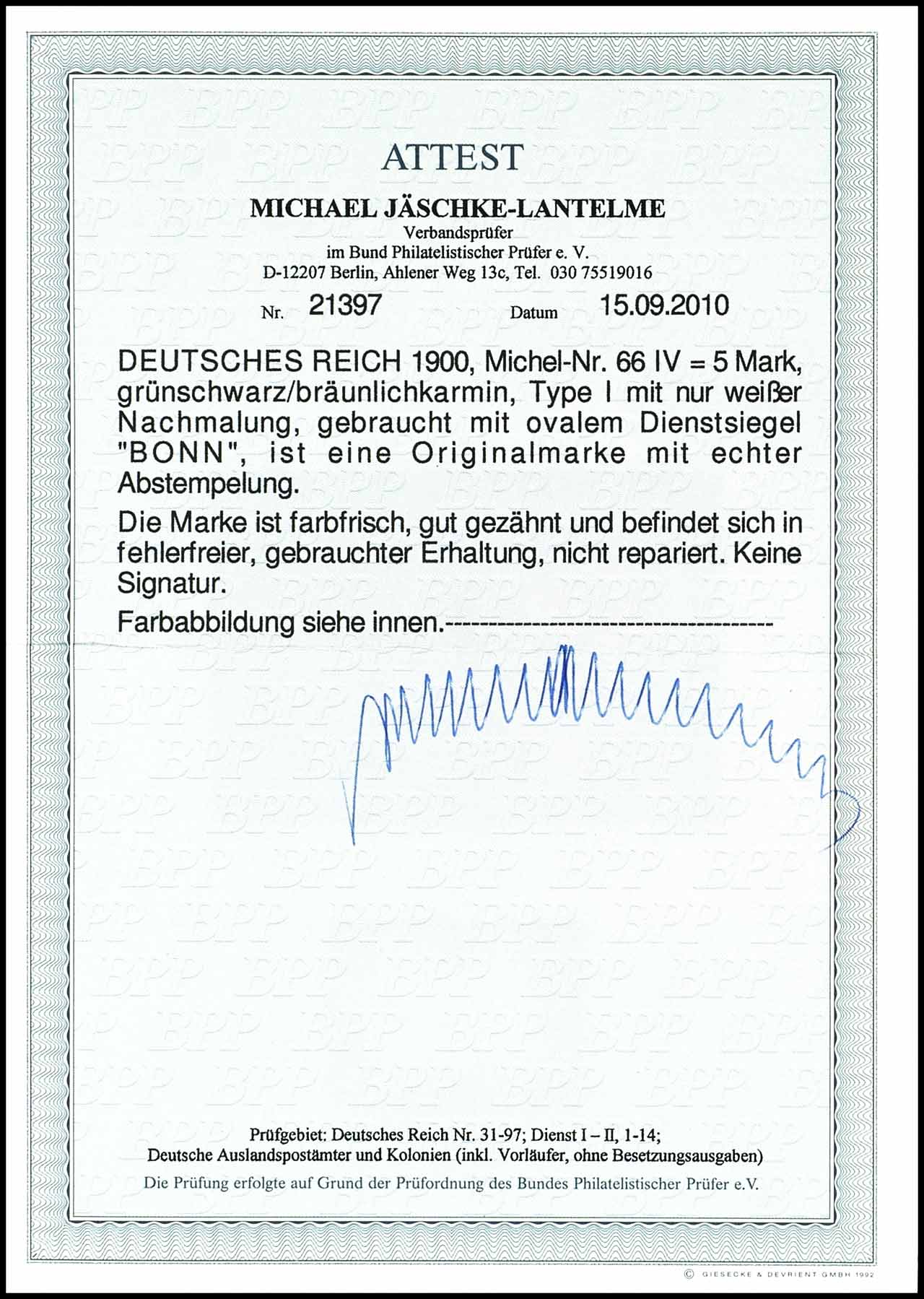 5 Mark Reichspost, grünschwarz/bräunlichkarmin, Type I mit nur weißer Nachmalung, entwertet mit ovalem Dienstsiegel "BONN", tadellose Erhaltung, unsigniert, Fotoattest Michael Jäschke-Lantelme BPP "in fehlerfreier, gebrauchter Erhaltung.", Mi. 800.-