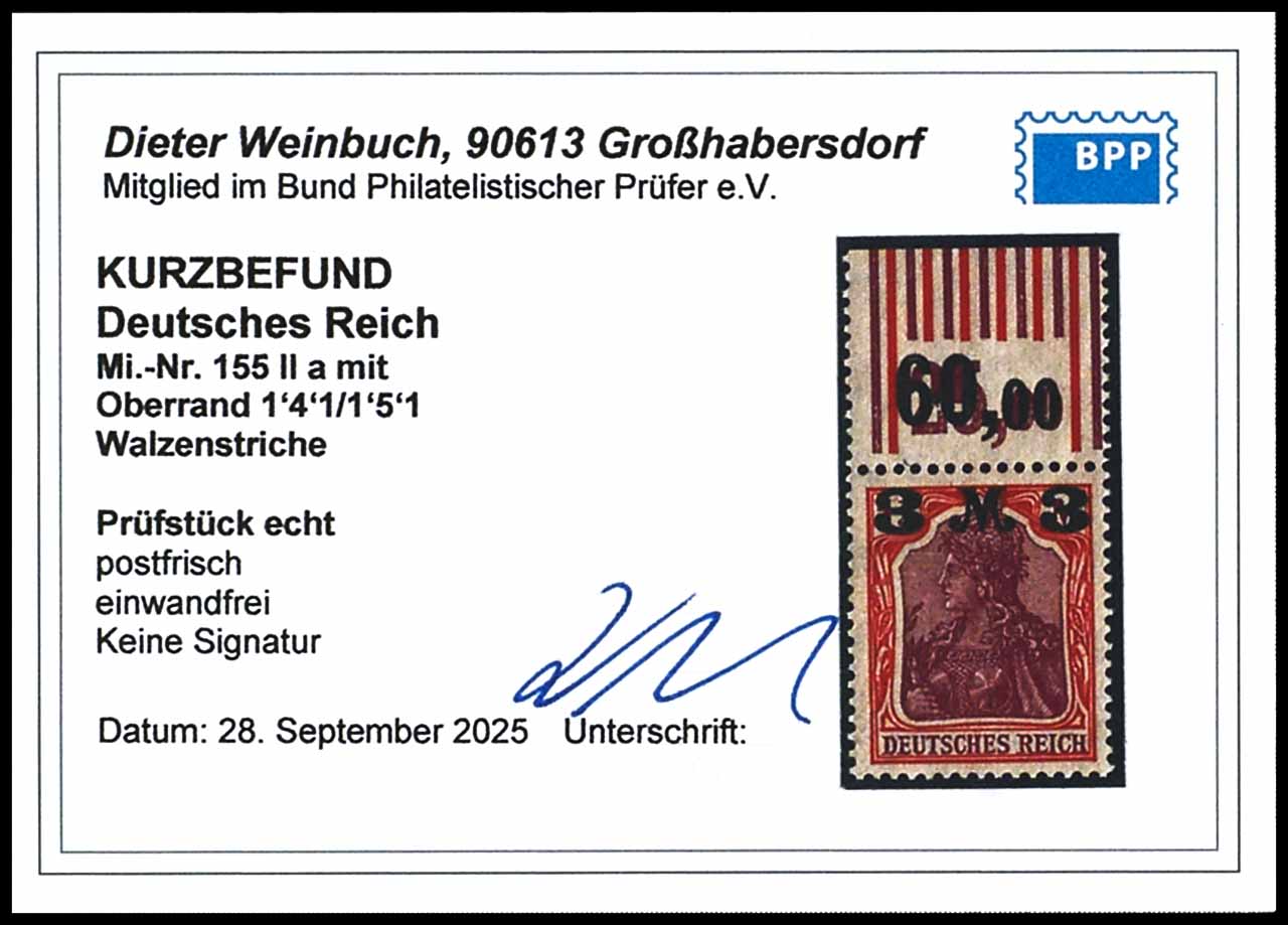 3 Mark auf 1 1/4 Mark orangerot/dunkelkarminlila, Aufdruckfarbe stumpf, Marke aus Walzendruck vom Oberrand 1'4'1/1'5'1 Walzenstriche, Bogenfeld 2, tadellose Erhaltung, unsigniert, Fotobefund Dieter Weinbuch BPP (2025) "einwandfrei", Mi. 150.-