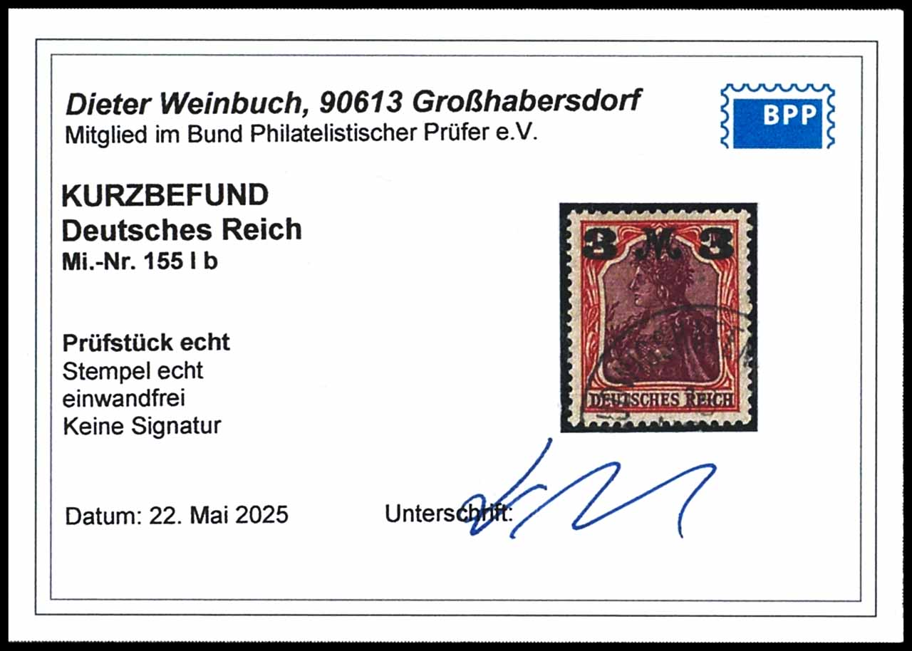1 1/4 Mark Germania, karminrot/dunkelkarminlila, b-Farbe, entwertet mit Teilabschlag eines nachverwendeten bayrischen Einkreisstempels von "LUDWIGSHAFEN....", tadellose Erhaltung, Fotobefund Dieter Weinbuch BPP (2025) "Die Erhaltung ist einwandfrei", Mi.280.- (unterbewertet)