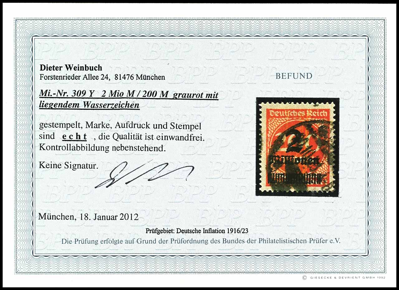 2 Millionen auf 200 Mark Ziffern mit liegendem Wasserzeichen, gestempelt, tadellose Erhaltung, Fotobefund Dieter Weinbuch BPP "die Qualität ist einwandfrei.", Mi. 450.-