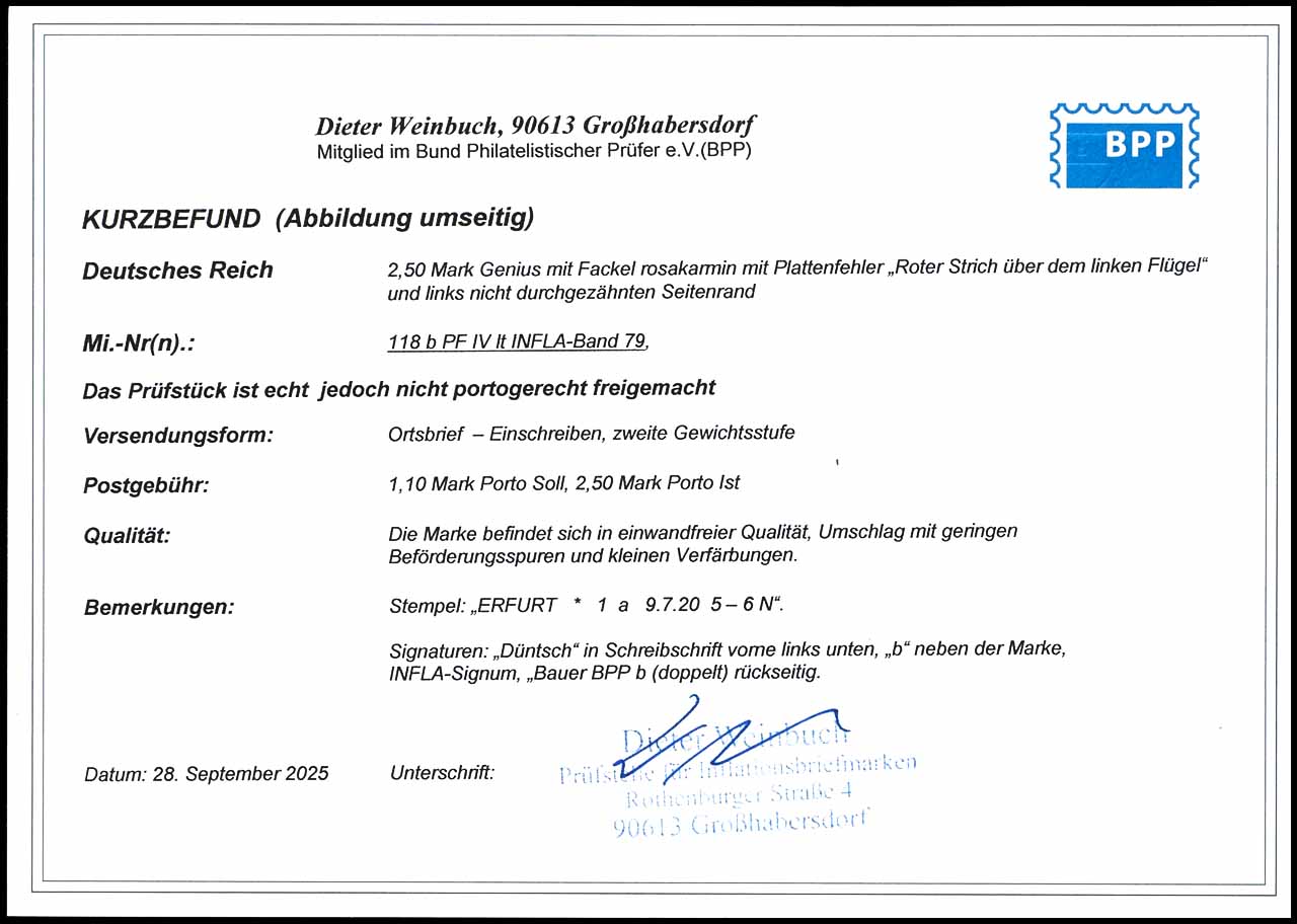 2,50 Mark auf 2 Mark Germania "Nord und Süd" im Stichtiefdruck, dunkelrosakarmin, vom linken, nicht durchgezähnten Seitenrand, Bogenfeld 9, mit Plattenfehler IV, nach Infla Band 79 "Roter Strich über dem linken Flügel" als Einzelfrankatur auf einem stark überfrankierten R-Orts-Brief, gestempelt "ERFURT * 1 a 9.7.20 5-6N", sehr gute Erhaltung, signiert Düntsch vorne links und "b" neben der Marke, INFLA-Signum Bauer BPP "b" rückseitig (doppelt), Fotobefund Dieter Weinbuch BPP (2025), "Die Marke befindet sich in einwandfreier Qualität, Umschlag mit geringen Beförderungsspuren und kleinen Verfärbungen", Mi./Infla Band79 600.-