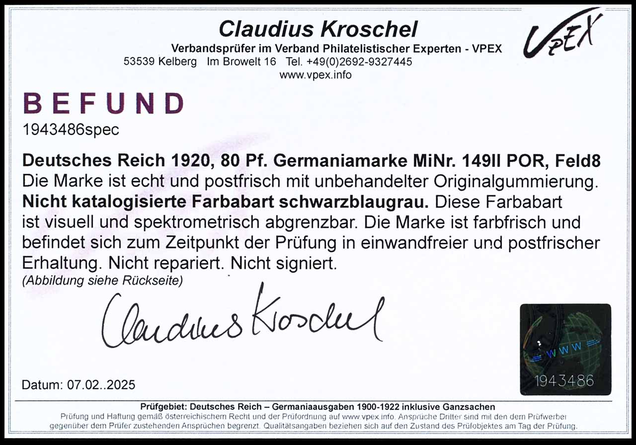 80 Pfennig Germania vom Plattenoberrand, Bogenfeld 8, nicht katalogisierte Farbabart schwarzgraublau, postfrisch, tadellose Erhaltung, unsigniert, Fotobefund Claudius Kroschel VPEX (2025) "einwandfreie und postfrische Erhaltung". Von dieser Farbabart wurden bisher nur sehr wenige Stücke bekannt. Bisher noch nie in einer Auktion angeboten.
