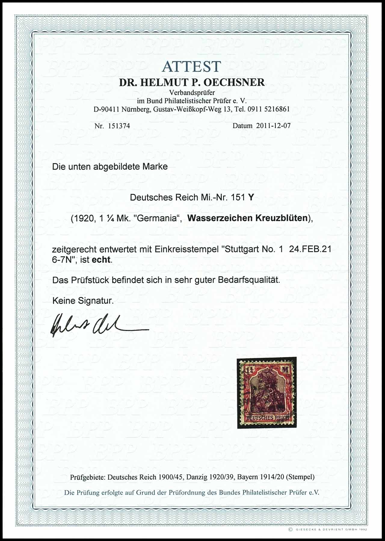 1 1/4 Mark Germania mit Wasserzeichen Kreuzblüten, entwertet mit Einkreisstempel "Stuttgart No. 1 24.FEB 21", Bedarfserhaltung, unsigniert, Fotoattest Dr. Helmut P. Oechsner BPP, Mi. 1.000.-