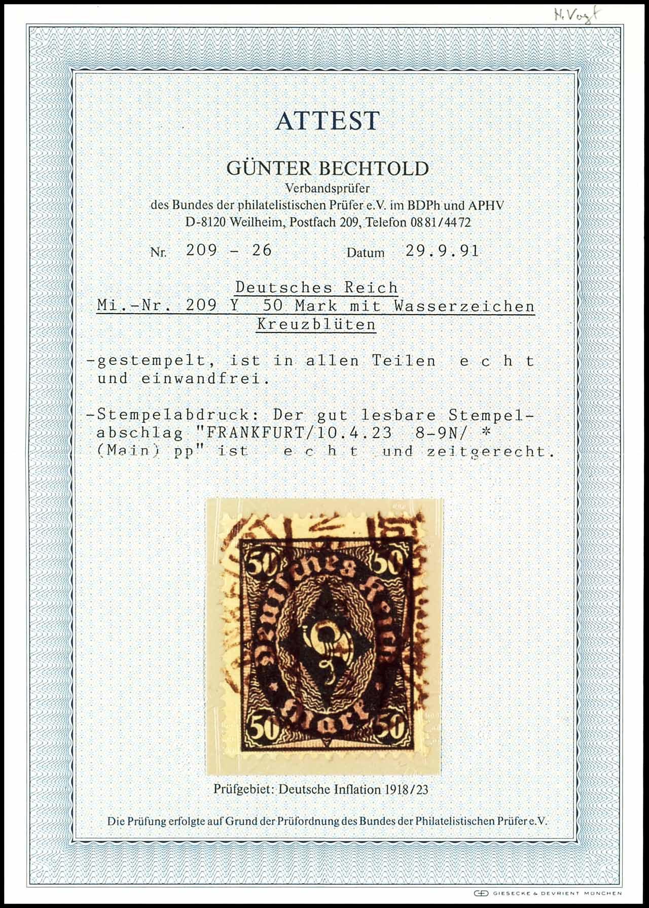 50 Mark Posthörnchen mit Vierpass-Wasserzeichen, zeitgerecht gestempelt "FRANKFURT 10.4.23", tadellose Erhaltung, Fotoattest Günter Bechtold BPP, Mi. 1.100.-