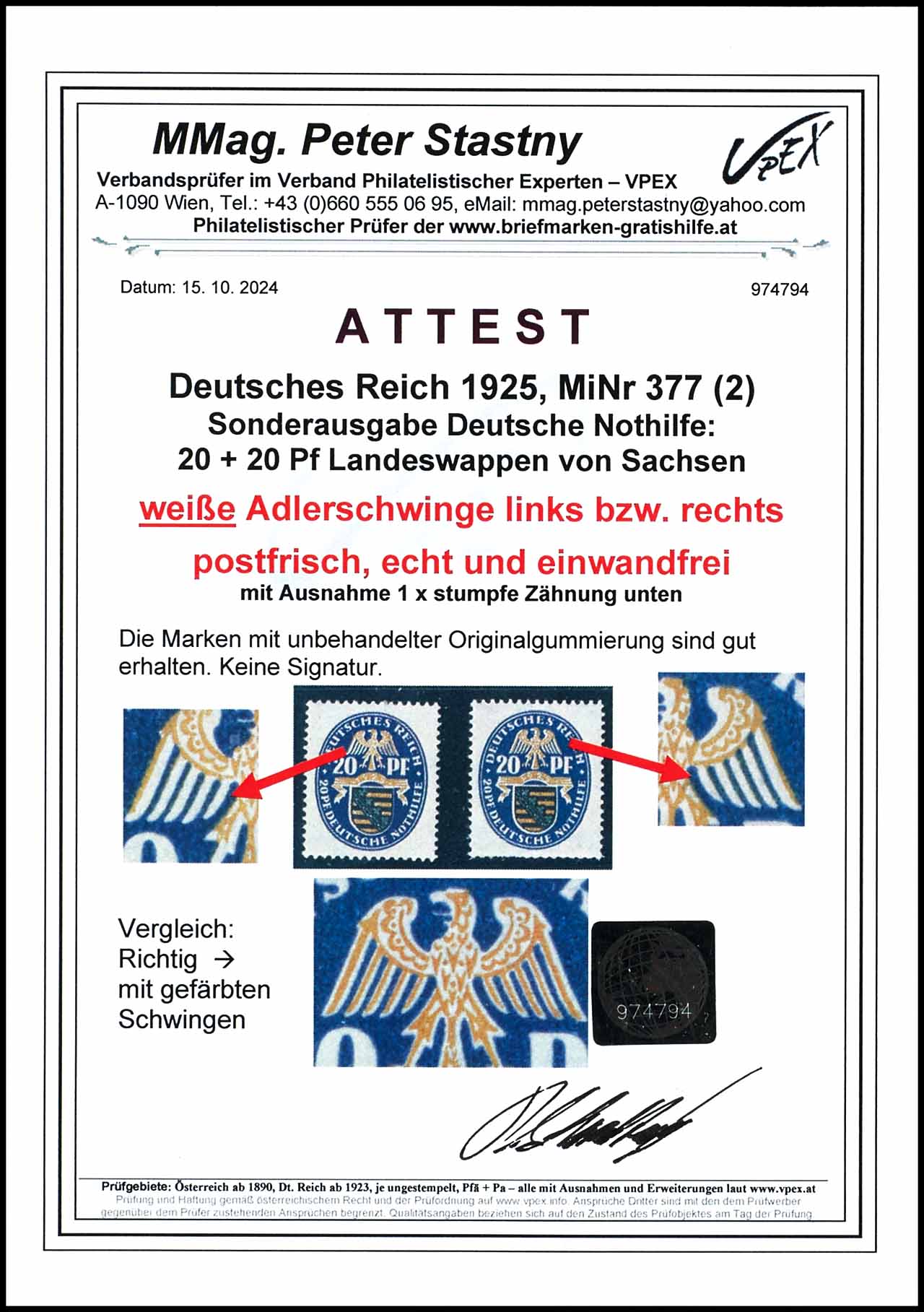 20 Pfennig Nothilfe Landeswappen Sachsen, Abart "weiße Adlerschwinge links bzw. rechts", postfrisch, eine Marke Zähnung unten stumpf, sonst tadellos, Fotoattest MMag. Peter Stastny VPEX