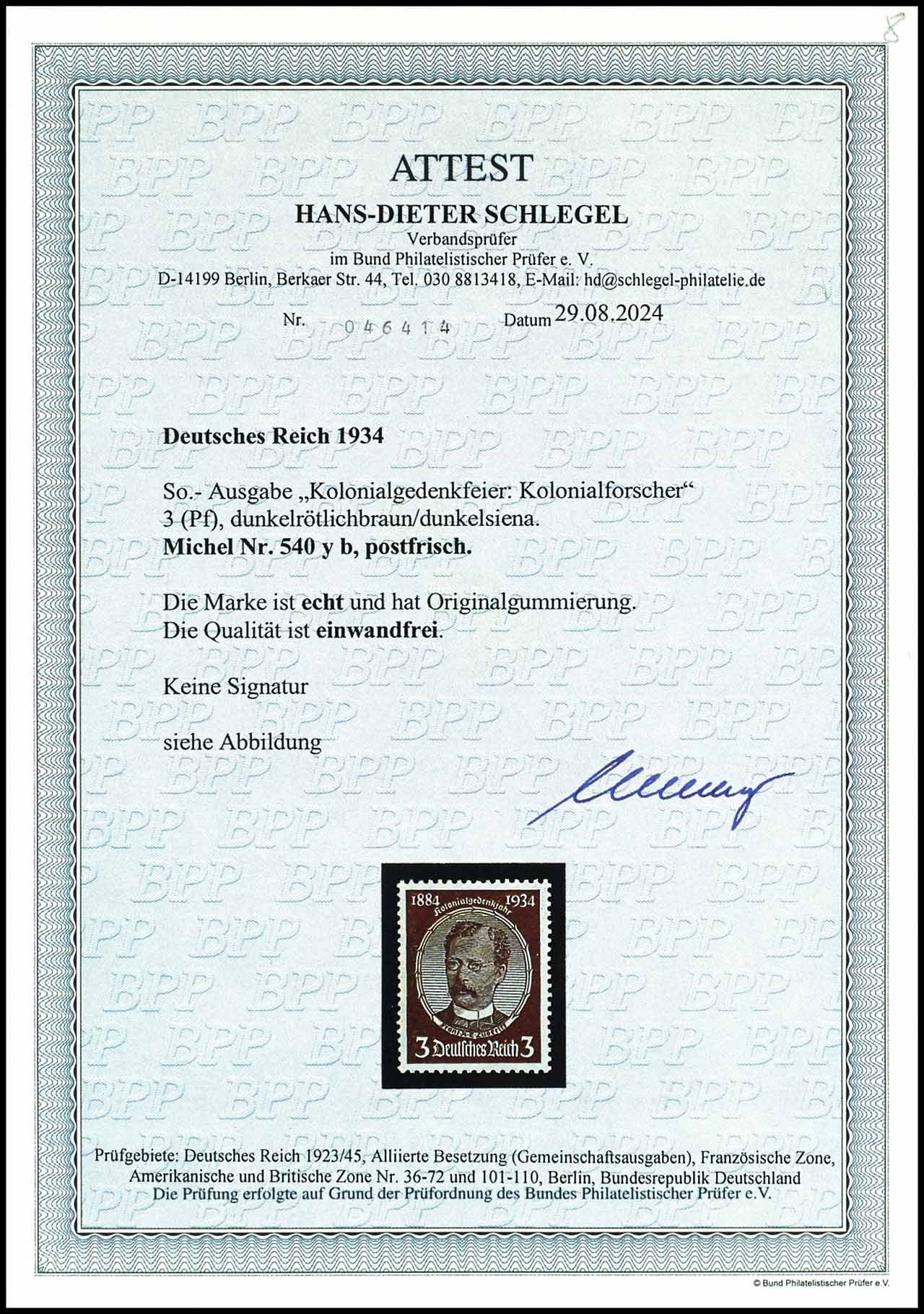 3 Pfennig Kolonialforscher Lüderitz, rötlichbraun/dunkelsiena, postfrisch, tadellose Erhaltung, unsigniert, Fotoattest Hans-Dieter Schlegel BPP (2024) "Die Qualität ist einwandfrei.", Mi. 1.400.- - seltene Marke!