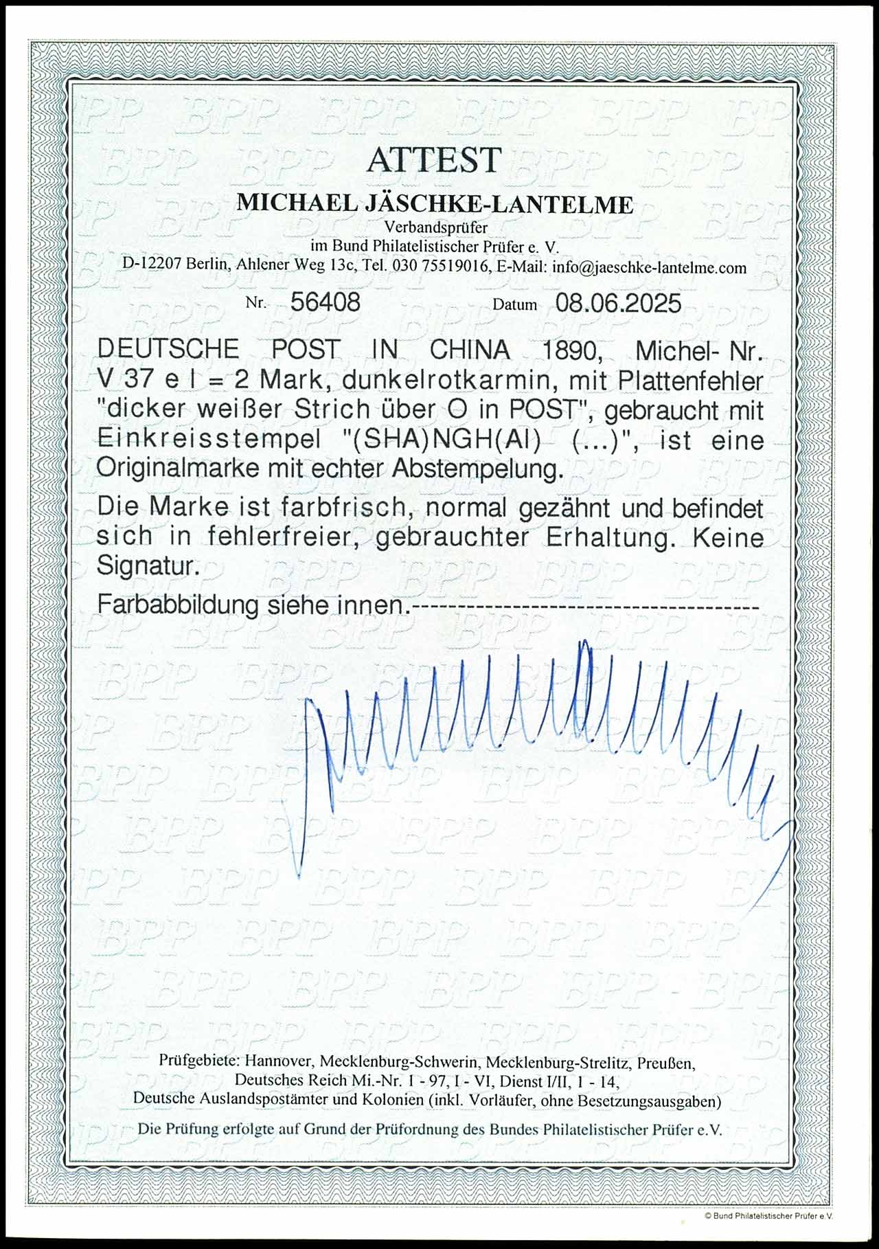 2 Mark dunkelrotkarmin, Plattenfehler I "dicker weißer Strich über O in POST", entwertet mit Einkreisstempel "SHANGHAI", tadellose Erhaltung, Fotoattest Michael Jäschke-Lantelme BPP "in fehlerfreier, gebrauchter Erhaltung."