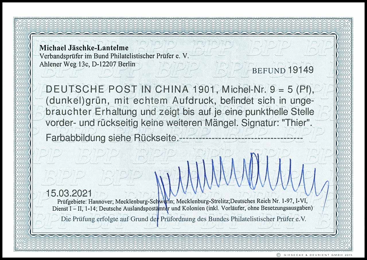 5 Pfennig Germania mit Handstempelaufdruck "China", ungebraucht mit Originalgummierung, insgesamt sehr frisches Exemplar der seltenen Marke, zwei kleine punkthelle Stellen, Fotobefund Michael Jäschke-Lantelme BPP