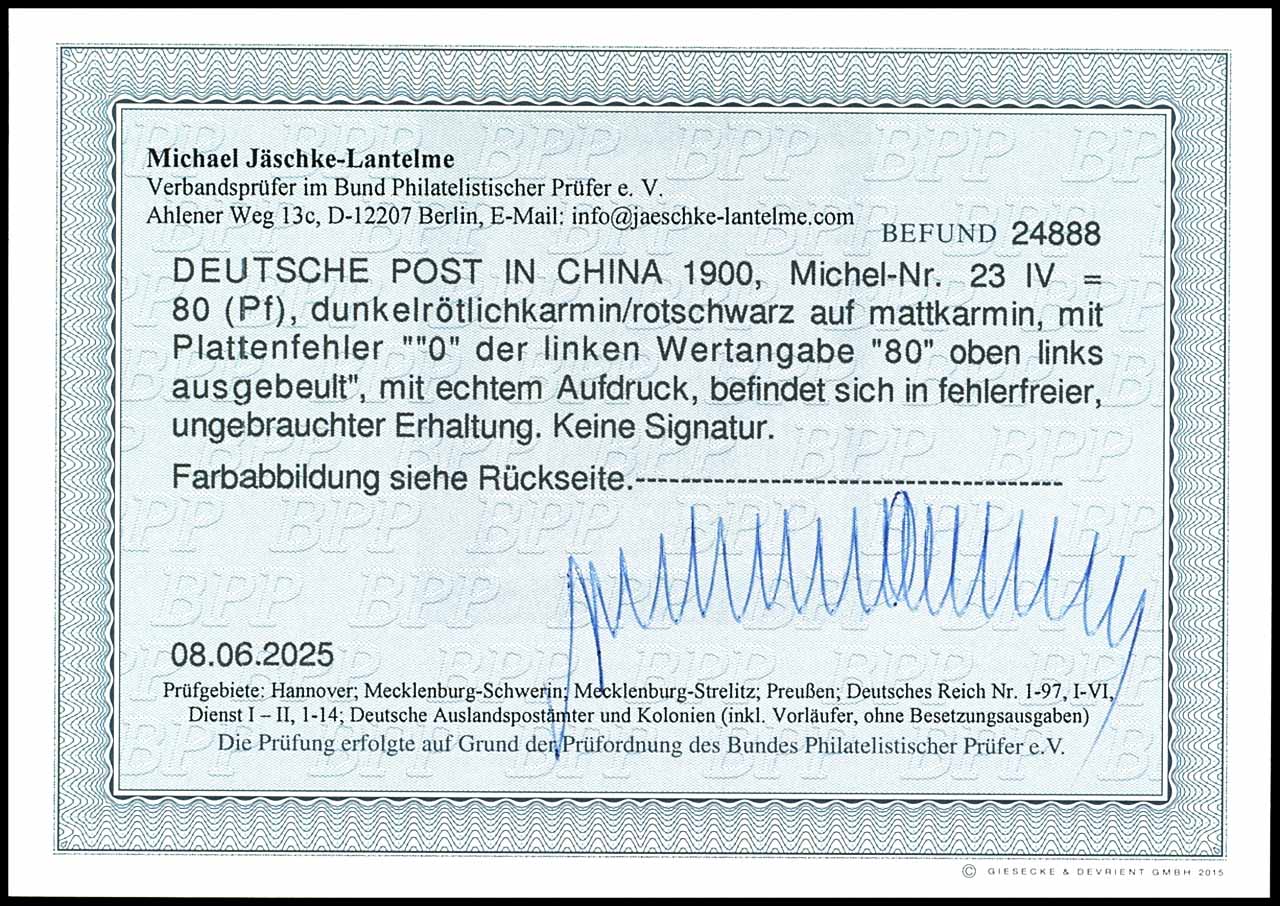 80 Pfennig Germania mit Aufdruck "China", Plattenfehler IV "0 der linken Wertangabe 80 oben links ausgebeult", ungebraucht mit Originalgummierung, tadellose Erhaltung, Fotobefund Michael Jäschke-Lantelme BPP "in fehlerfreier, ungebrauchter Erhaltung."