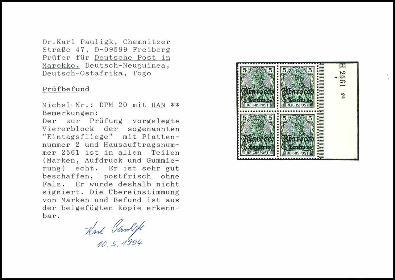 5 Centimos auf 5 Pfennig Kaiseryacht, Viererblock vom rechten Bogenrand mit Hausauftragsnummer "H 2561" und Plattennummer "2", postfrisch, tadellose Erhaltung, Fotobefund Dr. Karl Pauligk BPP